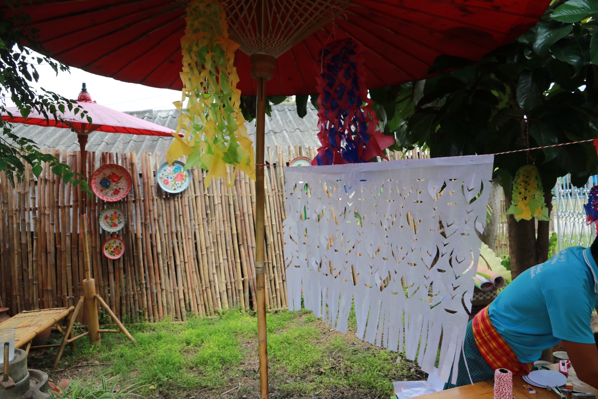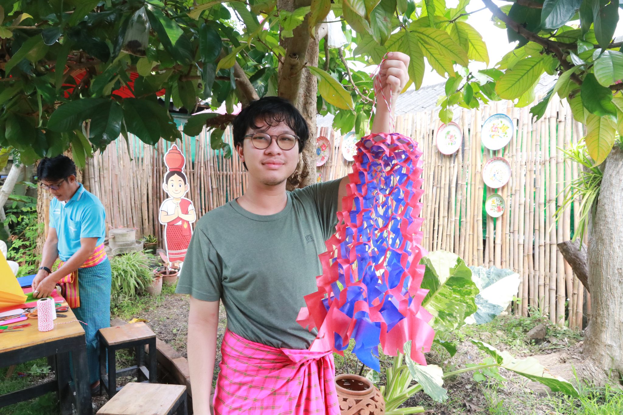 หลังจากทำบุญกันเสร็จแล้ว พวกเราก็เดินทางต่อมายังที่ ศูนย์การเรียนรู้วัฒนธรรมมอญ ซึ่งพอมาถึงได้ไม่ทันไร พวกเราก็ถูกจับแต่งชุดมอญกันทุกคนเลย ที่นี่พวกเราได้ลองทำพวงมโหตรและม่านพระอินทร์ ซึ่งเป็นของประดับตกแต่งของชาวมอญในงานพิธีต่างๆ