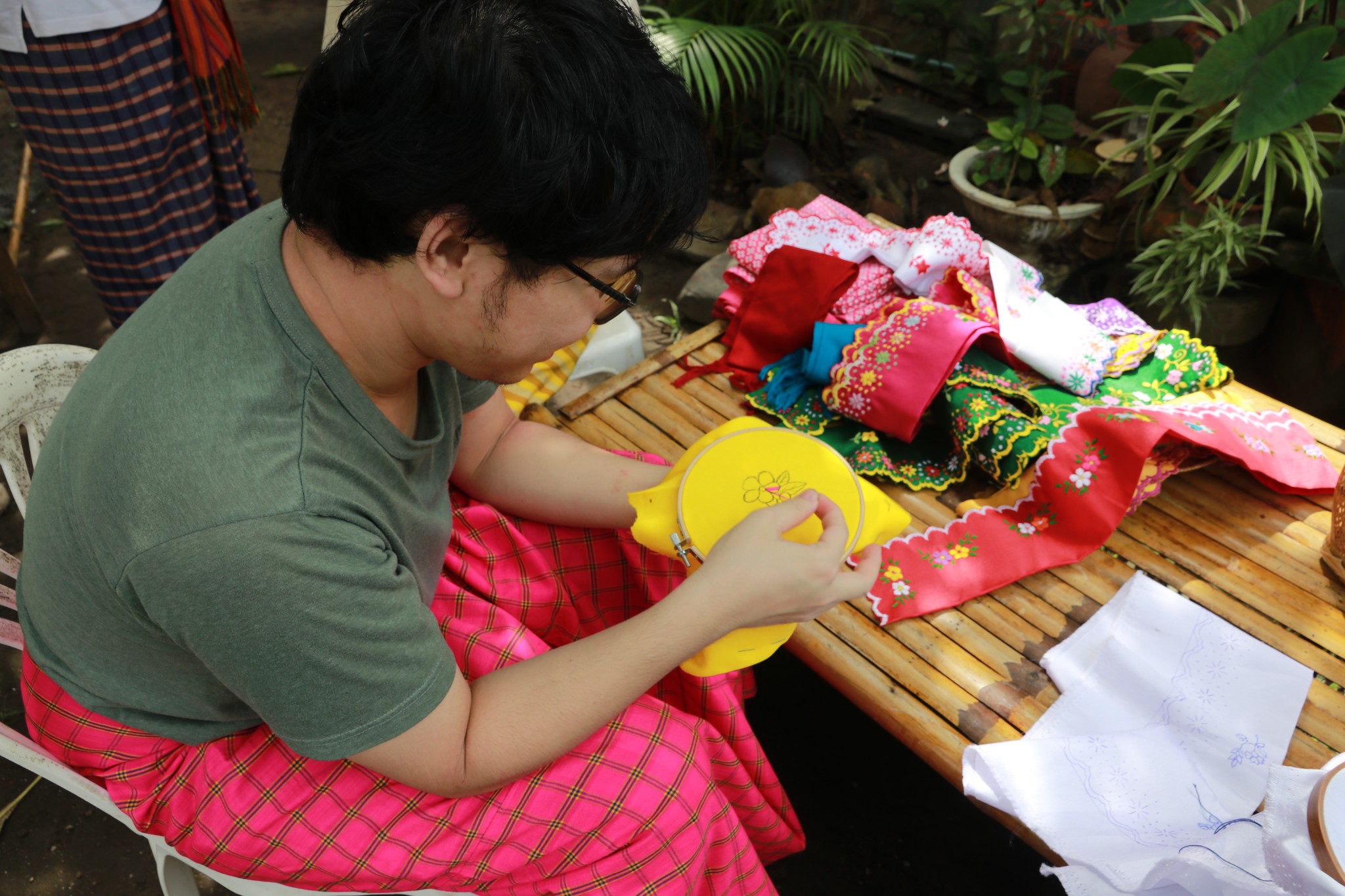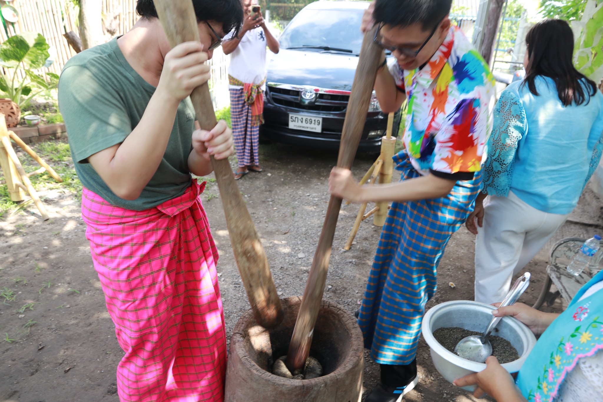 นอกจากนี้ยังได้ลองปักผ้า ทอผ้า และได้ทำแกงส้มมอญกินกันด้วย รสชาติของมันจะเปรี้ยวนำจากใบกระเจี๊ยบ และยังมีวัตถุดิบที่น่าสนใจอีกหลายอย่าง เช่น ใบแมงลัก กระเจี๊ยบมอญ และกระชาย ปิดท้ายด้วยการที่พวกเราได้ลองตำข้าวแดกงาซึ่งเป็นของว่างของชาวมอญมาเป็นของกินเล่นระหว่างทางอีกด้วย