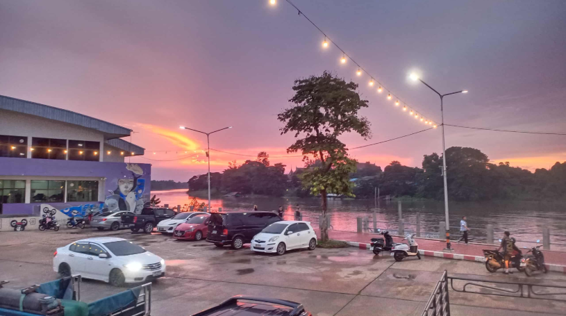 วันที่เราไปเป็นวันศุกร์ มีตลาดคนเดินในช่วงเย็นชื่อว่า ตลาดมังกรโพธาราม พวกเราจึงไปหาของกินกันที่ตลาดนี้ ซึ่งตลาดอยู่ไม่ไกลจากที่พักเลยค่ะ ระหว่างทางเดินก็ได้ชมบรรยากาศย่านเก่าโพธารามไปด้วยเพลินๆ นอกจากอาหารที่นี่จะอร่อยแล้ว ยังมีของน่าทานอีกหลายอย่าง แถมตลาดก็ติดริมแม่น้ำแม่กลอง การได้ไปในตอนเย็นจะได้เห็นพระอาทิตย์สีแดงสาดส่องอยู่ริมขอบฟ้า บรรยากาศดีสุดๆ ไปเลยค่ะ