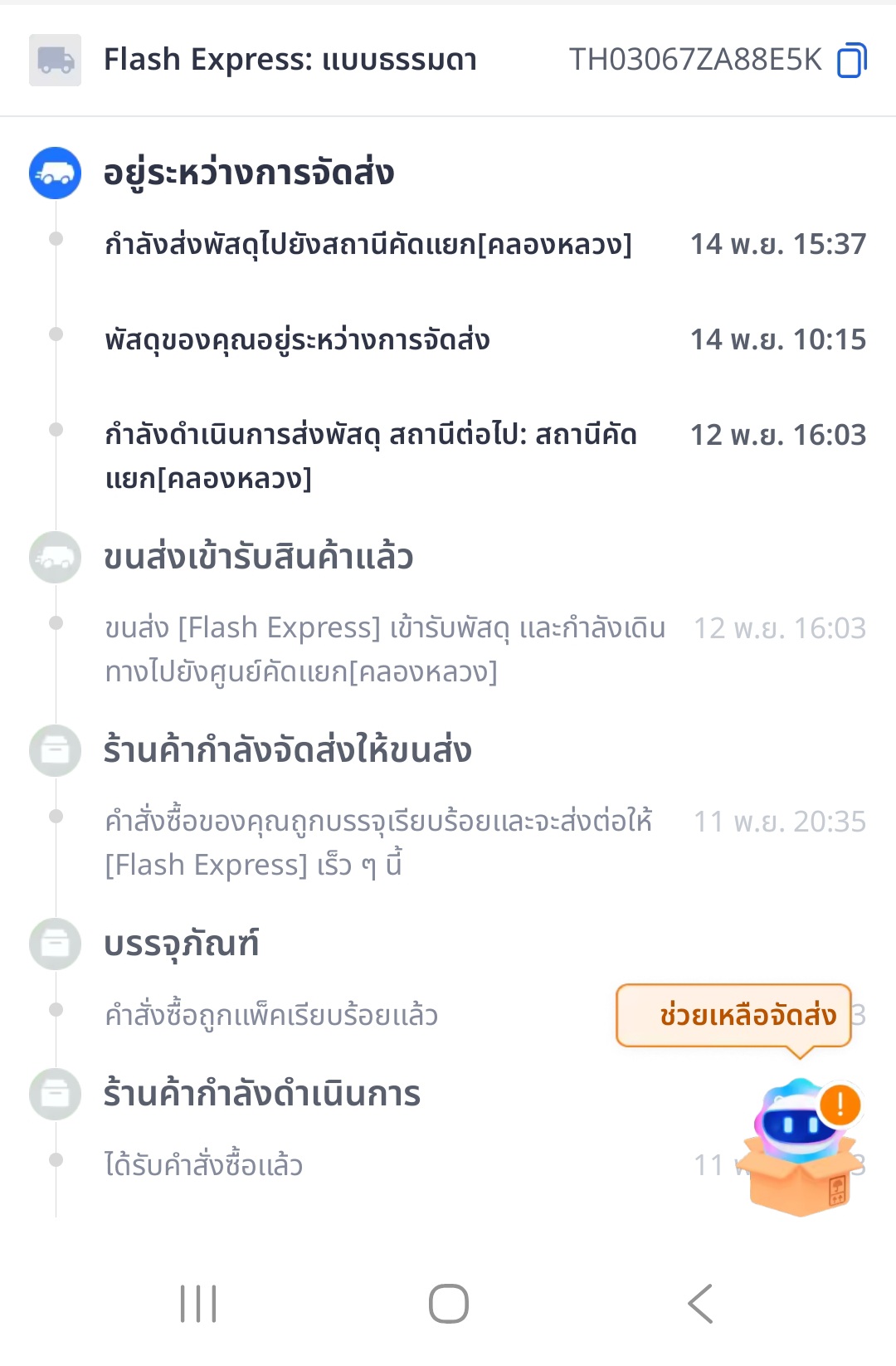 ผมสั่งซื้อสินค้ากลางคืนวันที่ 10 พ.ย. 2568 กำหนดการรับของวันนี้ 14 พ.ย. 2568 ขนส่งรับสินค้าตั้งแต่วันที่ 11 พ.ย. 2568 เวลา 12:15 น. เพื่อไปยังศูนย์คัดแยกบางเสาธง วันที่ 13 พ.ย. ผมเห็นว่าสถานะไม่เคลื่อ