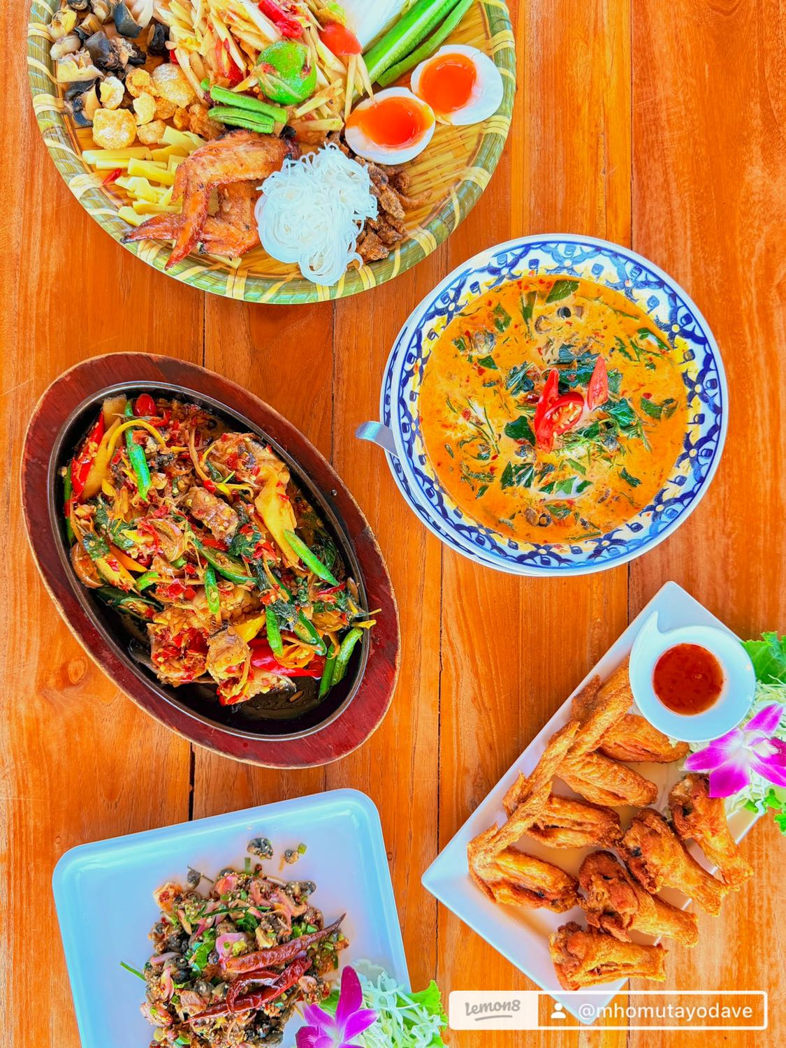เมนูอาหารหลากหลาย ทั้งของคาว ของหวาน และเมนูจิ้มจุ่มขึ้นชื่อ รายการอาหารที่ได้ชิมในวันนี้ ได้แก่ ตำถาดลาว, แกงคั่วหอยขม, ลาบหอยขมคม, ปีกและน่องไก่ทอด, ปลาดุก, ผัดฉ่ากระทะร้อน ทุกเมนูรสชาติอร่อย จัดจ้าน และทำออกมาได้มาตรฐานดีมาก