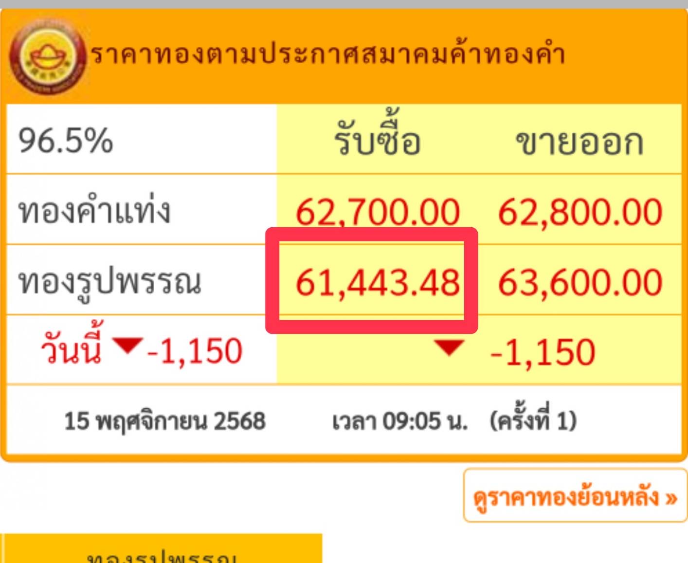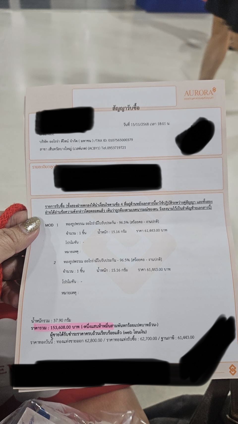 ต่อมาวันเดียวกันวันเสาร์ 15/11/68 เวลา 18.01 เพื่อนเรานำทอฃไปขายที่ร้านทองออโรร่า สาขา เซลทรัลเวสเกต ได้ราคา 61,443