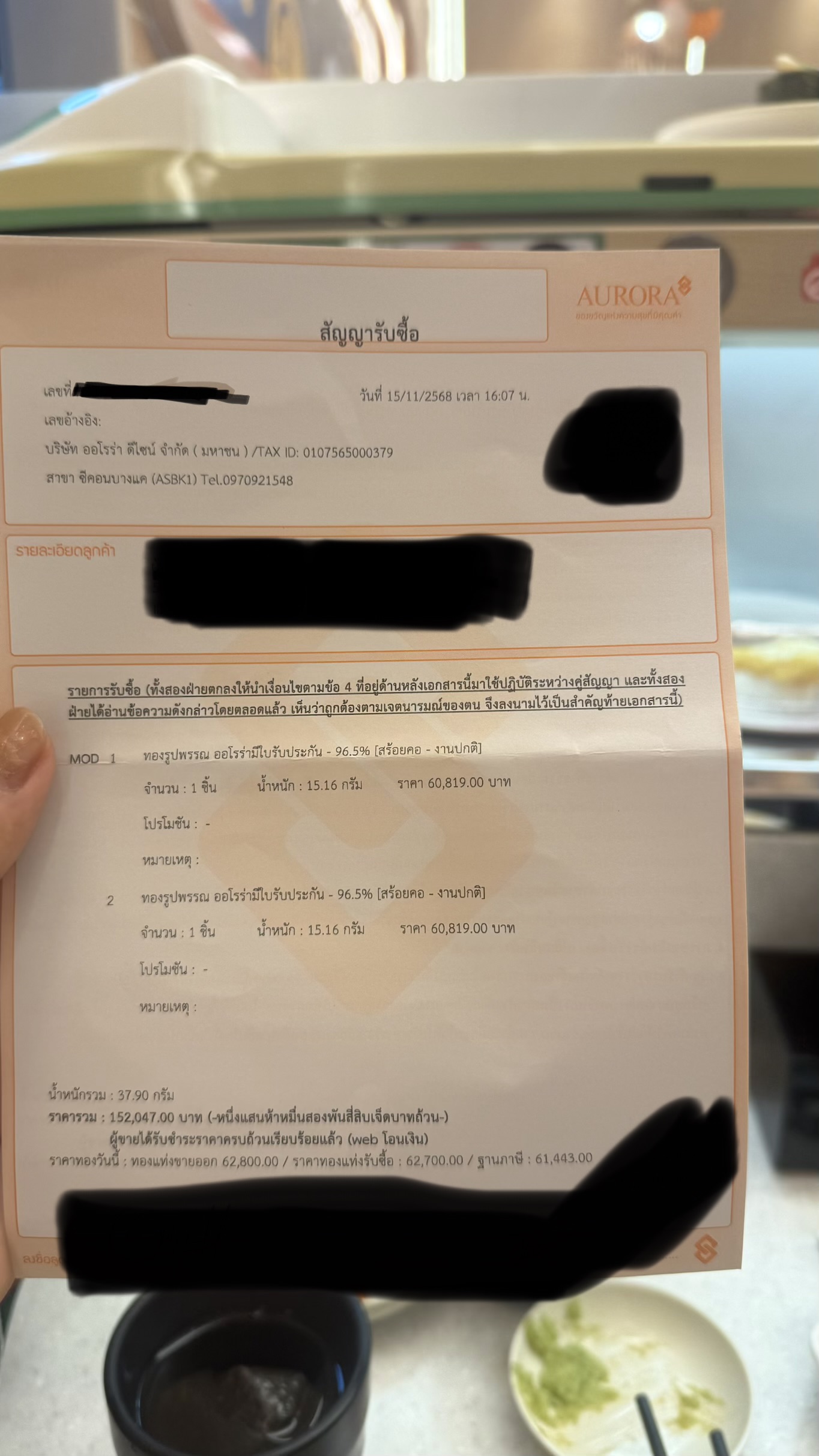 วันที่เสาร์ที่ 15/11/68 เวลา 16.07 น. เราไปขายทองที่ร้านทองออโรร่า สาขาซีคอนบางแค ราคารับซื้อรูปพรรณ 60,819 บาท