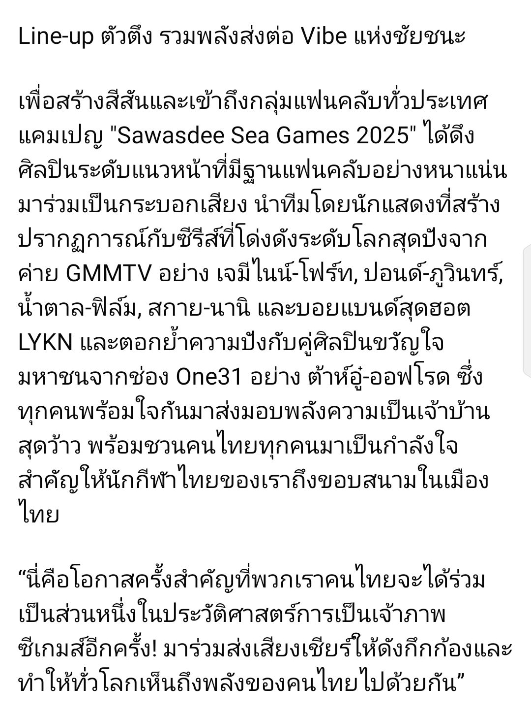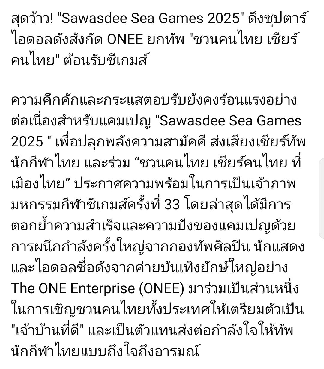 🤩 "Sawasdee Sea Games 2025" ดึงซุปตาร์ไอดอลดังสังกัด ONEE ยกทัพ "ชวนคนไทย เชียร์คนไทย" ต้อนรับซีเกมส์