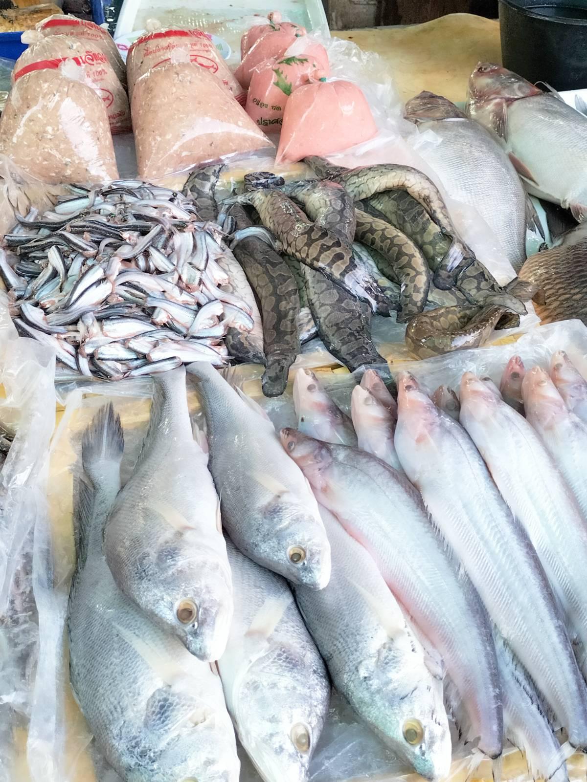 ช่วงนี้น้ำกำลังหลาก มีความอุดมสมบูรณ์ ปลาหลายชนิด ทั้งแบบที่เห็นได้ทั่วๆไปและปลาหายาก มีมาวางขายในตลาด ให้ได้เดินชม เดินช็อปกันเพลินๆ แต่ถ้าจะให้เยอะกว่านี้ ต้องรอช่วงน้ำลด ซึ่งก็น่าจะราวๆ ปลายเดือน พฤศจิกายน - กุมภาพันธ์ ปลาช่วงนี้จะเยอะ และกินอร่อยเป็นพิเศษ