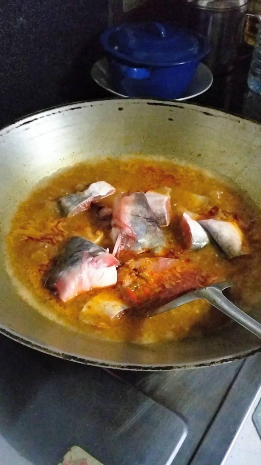 2. พอน้ำเดือดจัด ปรุงรสด้วยน้ำปลา น้ำตาลเล็กน้อย จากนั้นนำชิ้นปลาใส่ตามลงไป รอจนปลาเริ่มสุก