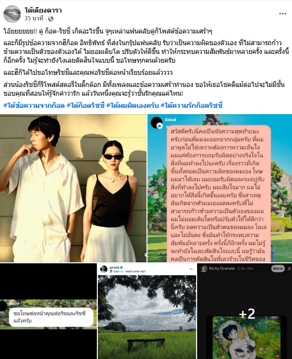 กลายเป็นประเด็นที่ถูกจับตามองอย่างหนัก สำหรับคู่รักสุดหวาน ก็อต อิทธิพัทธ์ และ ริชชี่ อรเณศ ที่คบหากันมานานถึง 6 ปี หลังทั้งคู่พร้อมใจกันโพสต์ภาพ คลิปวิดีโอ และเพลงในโซเชียลที่ให้ความรู้สึกเศร้า จนหลายคนตั้งข้อสังเกตว่าอาจกำลังเผชิญปัญหาเรื่องความรัก