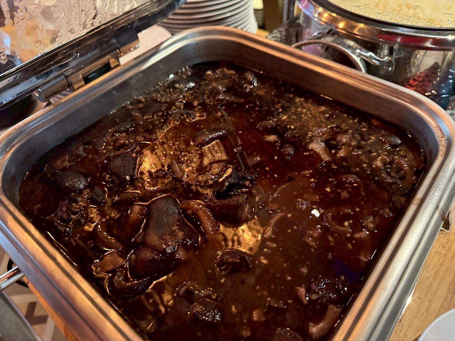 เป็นสตูว์ถั่วดำที่เคี่ยวกับเนื้อสัตว์หลายชนิด โดยเฉพาะเนื้อหมูส่วนต่างๆ (หมูสามชั้น, ซี่โครง, ไส้กรอกรมควัน) และบางครั้งก็มีเนื้อวัวร่วมด้วย เคี่ยวจนเปื่อยนุ่มและมีรสชาติเข้มข้น วันนี้ที่ลองชิมเป็สามชั้นใส่ถั่วดำเคี่ยวเข้มข้น อร่อยดีแต่มันไปนิด