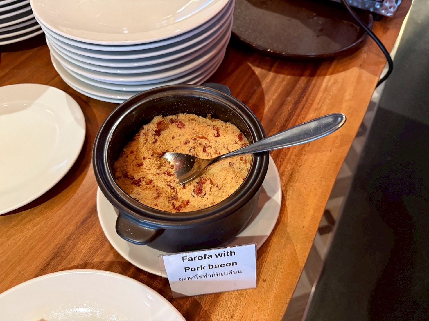 ที่นี่จะ ใส่เบคอน ) เป็น Farofa com Bacon แป้งมันสำปะหลังคั่วใส่เบคอน เป็นเครื่องเคียงที่ต้องทานคู่กับเนื้อและ Feijoada เพื่อเพิ่มรสสัมผัสที่กรุบกรอบ และ ทานกับเนื้อช่วยซับน้ำเนื้อได้ดี