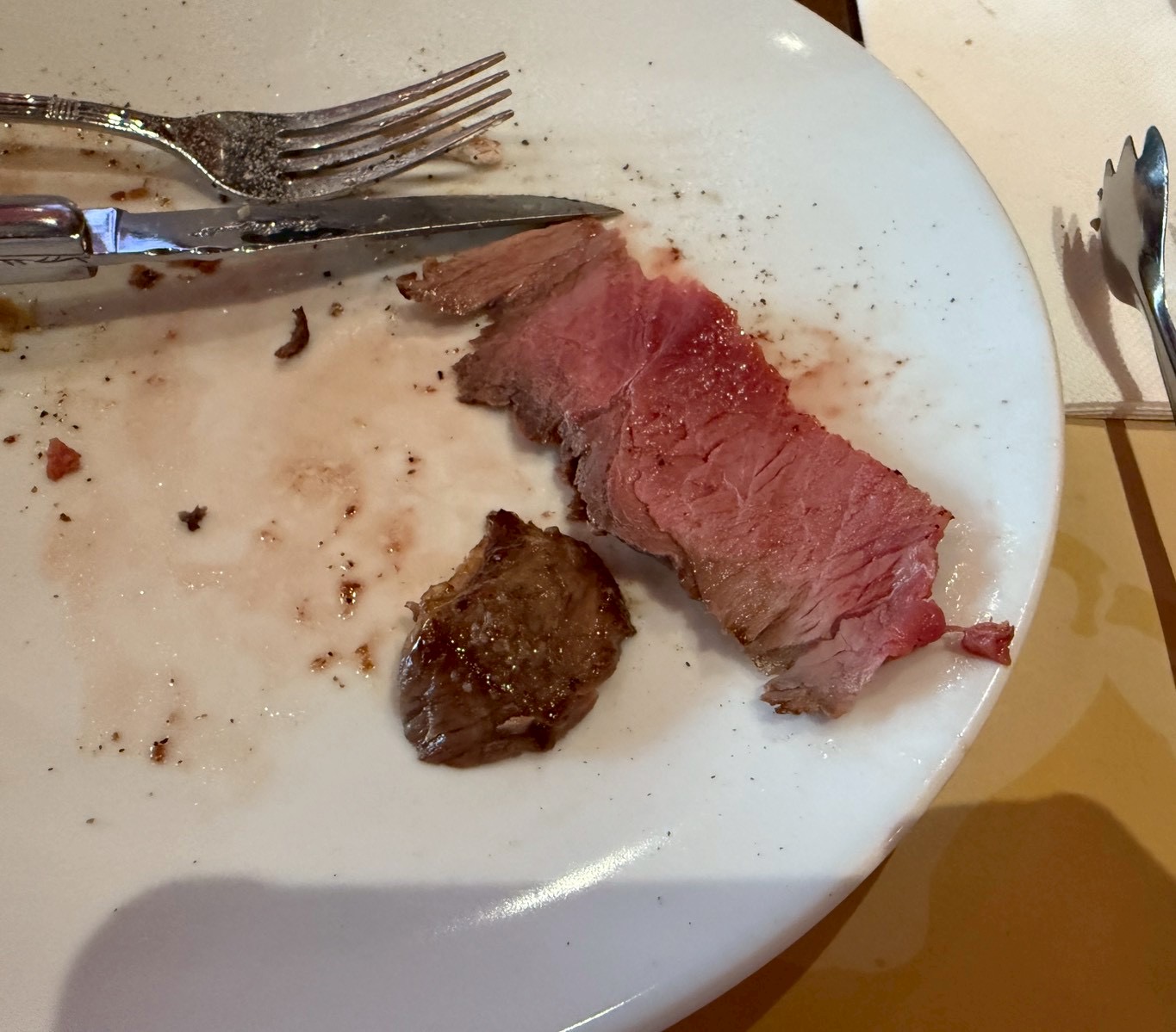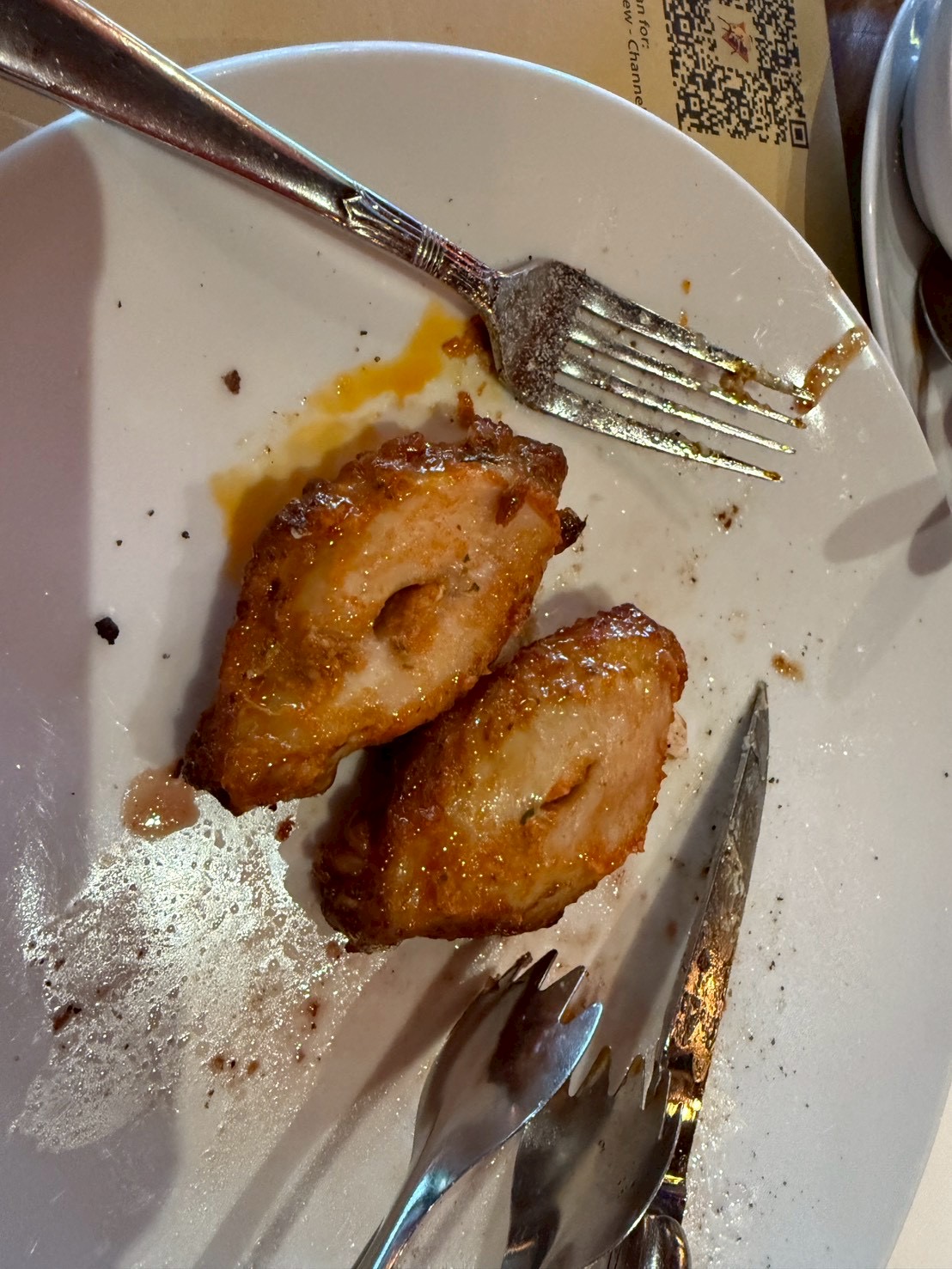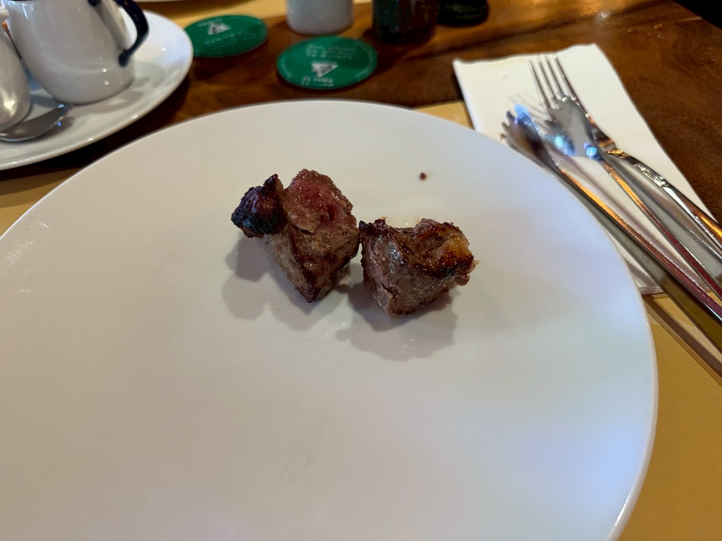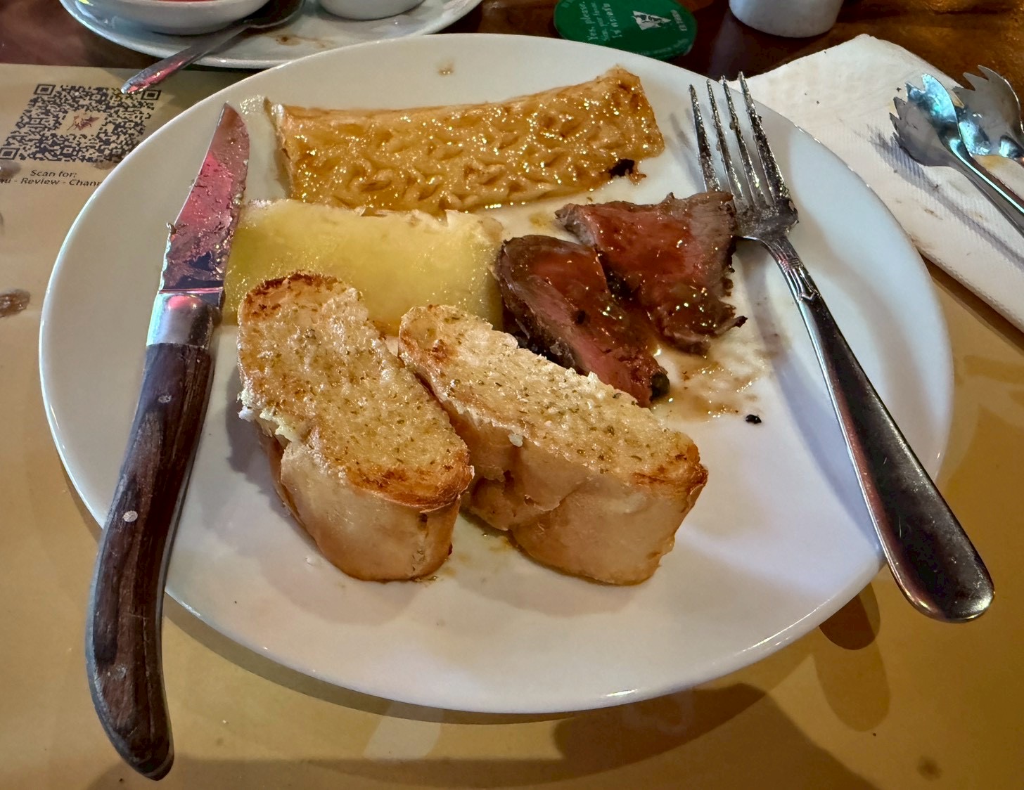 แต่เนื้อที่อร่อยสุดวันนี้ ยกให้เนื้อที่เค้าบอกว่าเป็น galic beef เนื้อย่างกระเทียม ชื่อโปรตุเกต ของเมนูนี้ คือ Alcatra com alho(อัลคาต้า คอมอัลยู) มันุ่มขนาด ตอนตับเนื้อจากเหล็กที่เค้าส่งให้ นั่นรู้สึกนุ่มมือ แล้ว ตอนกินสุกพอดี นุ่มหอม อร่อยมาก อร่อยจนกินครบทุก อย่างต้องเรียกเค้าเอามาเสริฟ เพิ่ม แค่รอบสอง สุกไปนิด แน่ก้อยังอร่อย ถาม พนักงานที่เอามา้สริฟว่า เป็น Filet mignon (Tenderloin) มั้ย คือมันนุ่มมาก เค้าบอก Sirloin แอบแปลกใจ และไม่เชื่อ 555