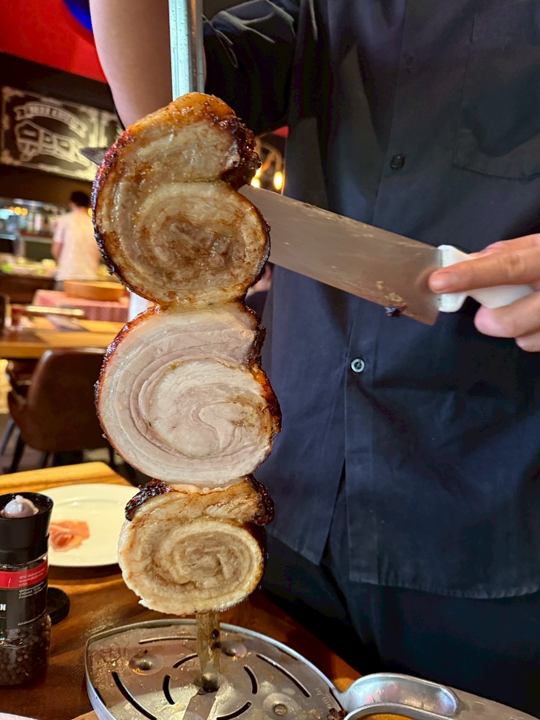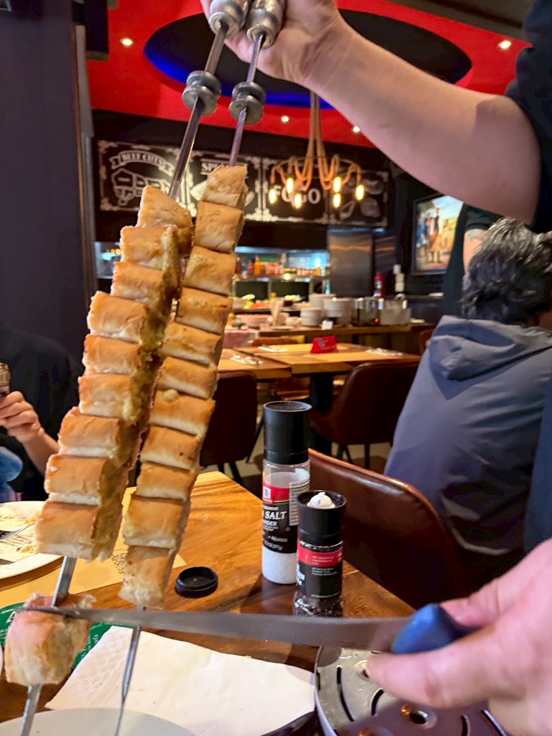 ย่างและอาหารอื่นๆ เสียบไม้เหล็กยาวๆ แล้วนำมาสไลด์เสิร์ฟที่โต๊ะ (Rodízio Style) และมีสลัดบาร์ที่ให้เราตักเอง