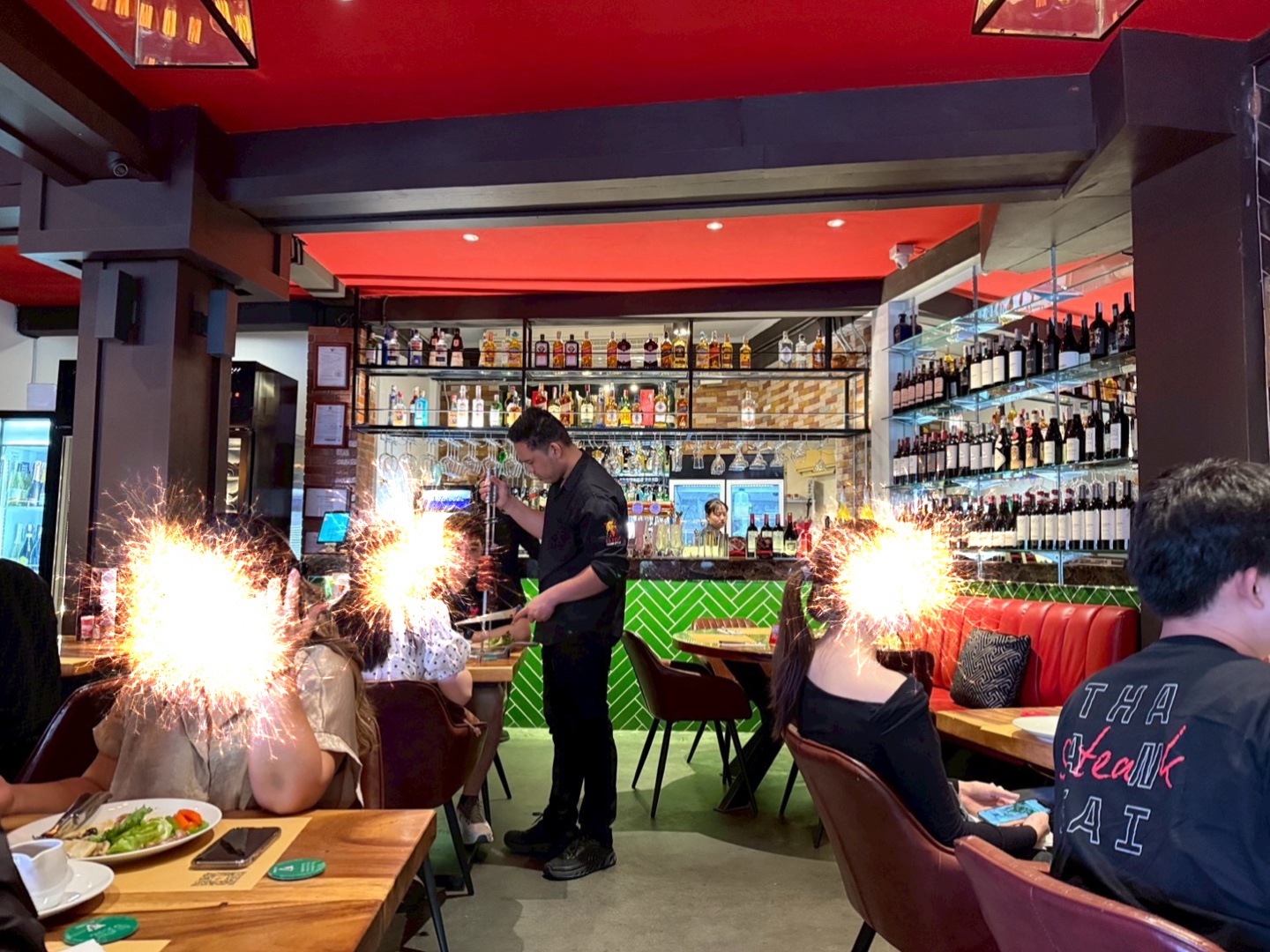 เข้าร้านไปพนักงาน หนุ่มบราซิลสองคนปรี่มาทัก แบบกันเอง และพาไปนั่งโต๊ะ แบบเฟรนด์ลี่มากๆ