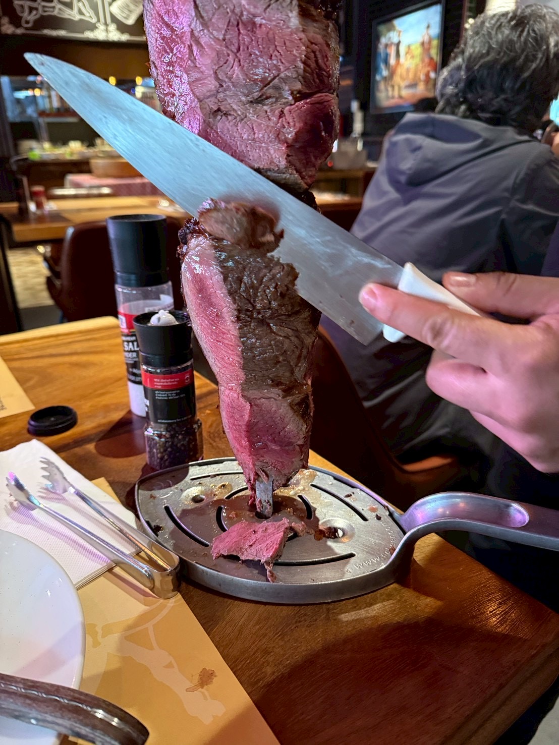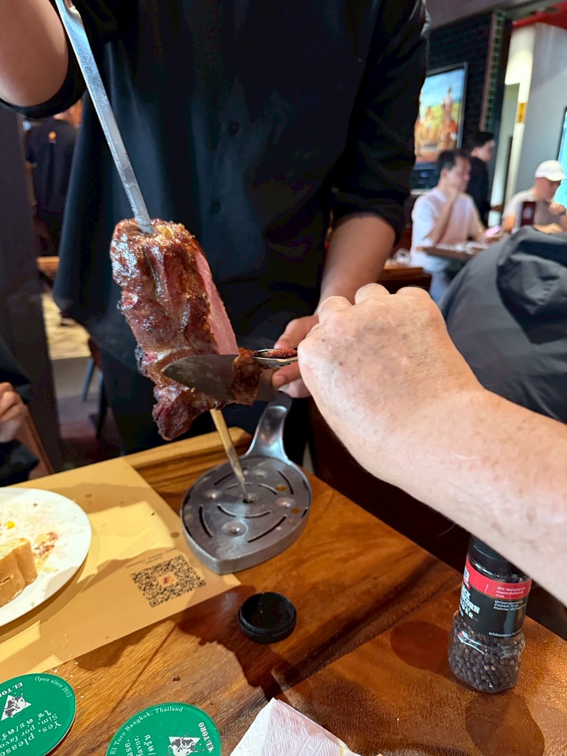 นอกจากสลัดบาร์แล้วความสนุกความอร่อยส่วนใหญ่ อยู่ที่เมนู ที่มาสไลด์เสิร์ฟให้ที่โต๊ะ สไตล์ (Rodízio Style) เลย เนื้อเค้าแวะมาเรื่อยๆ เปลีายนตัวมาให้เลือกตลอดไม่ขาดสาย แม้ลูกค้าเต็มร้าน แต่จังหวะพอดี อันไหน ไม่เอาบอกผ่านได้ หรือไม่พูดภาษาอังกฤษ ใช้ป้ายบอกเค้าได้เอาไม่เอา