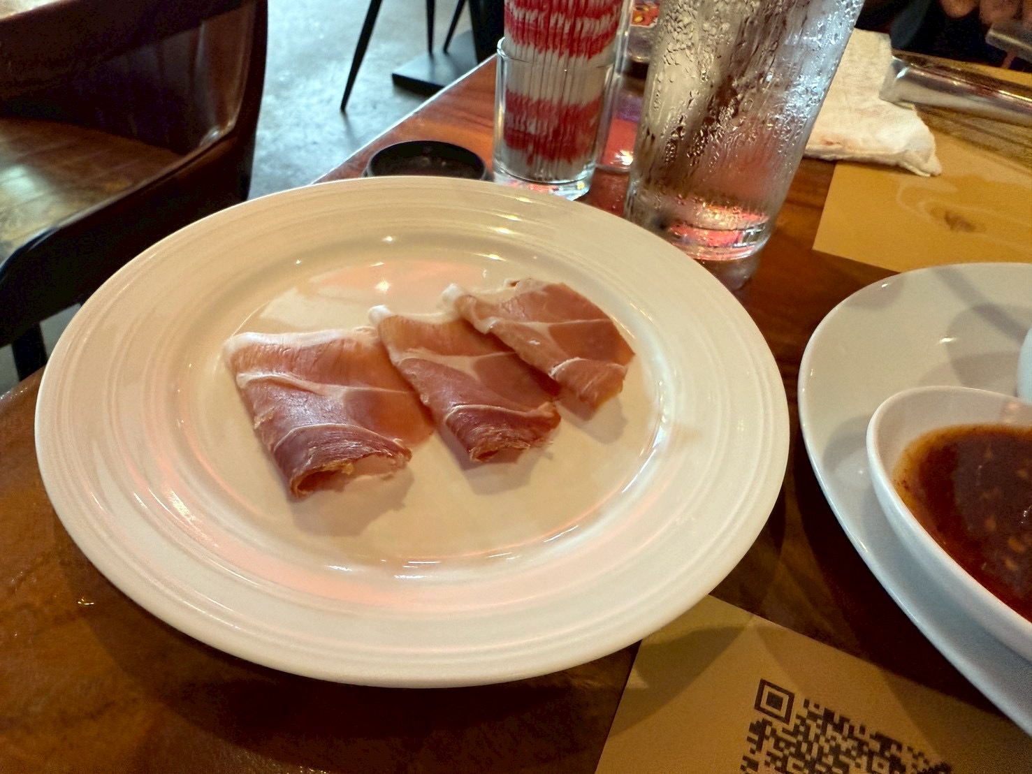 อีกเมนูที่เค้าเสริฟ มา แล้วผมเห็น ปุ๊บถามพนักงานเสริฟ เค้าชาวเมียนมา ด้วยภาษาอังกฤษ ว่า อันนี้ Pancetta (เบค่อน อิตาเลี่ยนใช่มั้ย) เค้า บอกไม่ใช่ แต่บอกเป็นชื่อแปลกๆ ฟังไม่ออก ถามเค้าว่า มันคืออะไร เค้าบอก หมูสามชั้น เลยยิ่งมั่นใจว่า มันคือ Pancetta กลับมาเอารูปทีาถ่ายไว้ะาม Gemini AI มันยืนยันว่าคือ