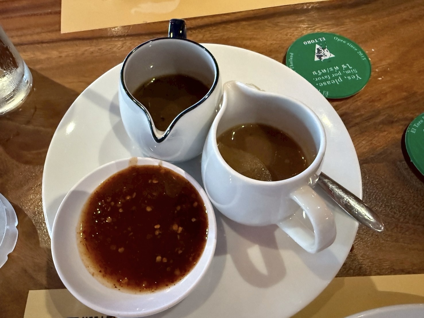 กับมี ซอร์สสามอย่าง แจ่ว เกรวี่ และ pepper gravy ให้เลือกทาน แต่ส่วนใหญ่แค่เกลือพริกไทยก้อฟินแระ