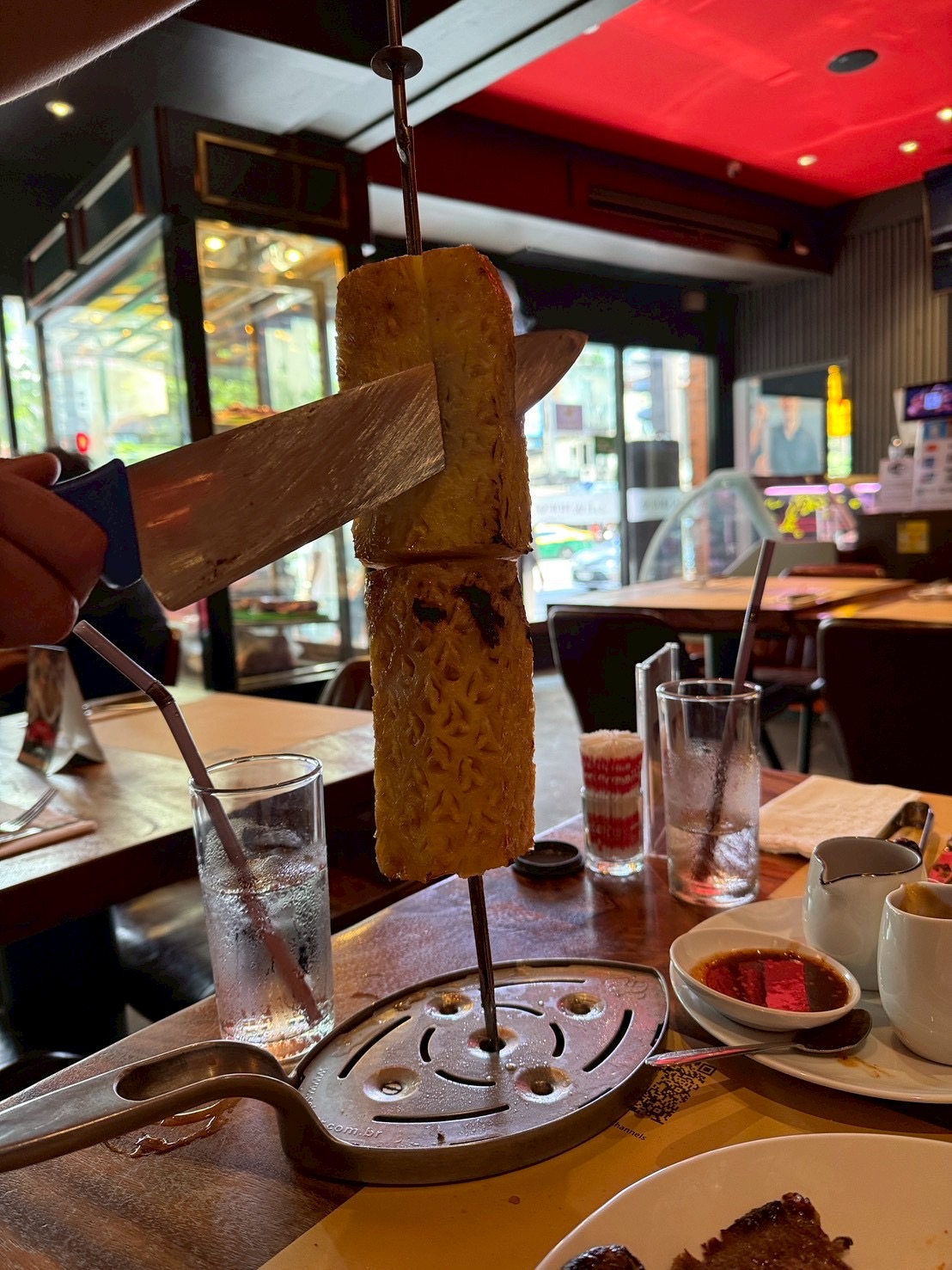 สับปะรดย่าง |ซึ่งเป็นครั้งแรกที่ผมกินสัปปะรดย่างไฟ เมูนี้ เค้าเอาสับปะรดโรยอบเชยแล้วย่าง ชื่อภาษาโปรตุเกส คือ Abacaxi Grelhado (อาบาคาชี่ เกรลยาดู) การย่างช่วยเพิ่มความหวาน ลดการกัดปากลง เป็นเมนูหลัก อีกตัวของอาหารบราซิล สไตล์นี้ที่เอาไว้ล้างปาก และช่วยย่อยเนื้อที่กินไปเยอะๆ