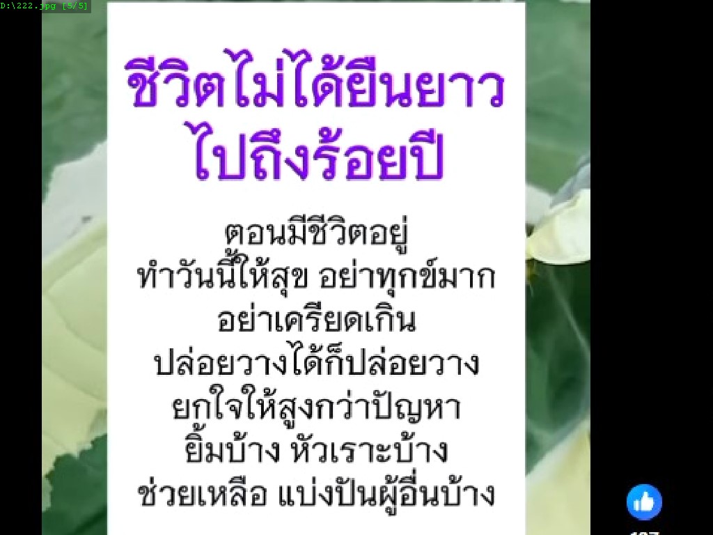 ชีวิตไม่ได้ยืนยาวไปถึงร้อยปี ตอนมีชีวิตอยู่ทําวันนี้ให้สุข อย่าทุกข์มาก ปล่อยวางได้ก็ปล่อยวาง ยกใจให้สูงกว่าปัญหา