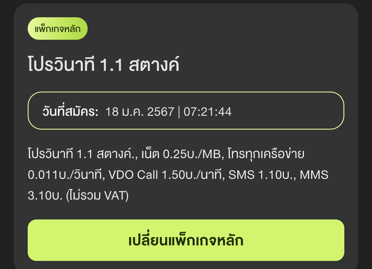 สอบถามแพคเกจหลักเติมเงิน โปรวินาที 1.1 สตางค์