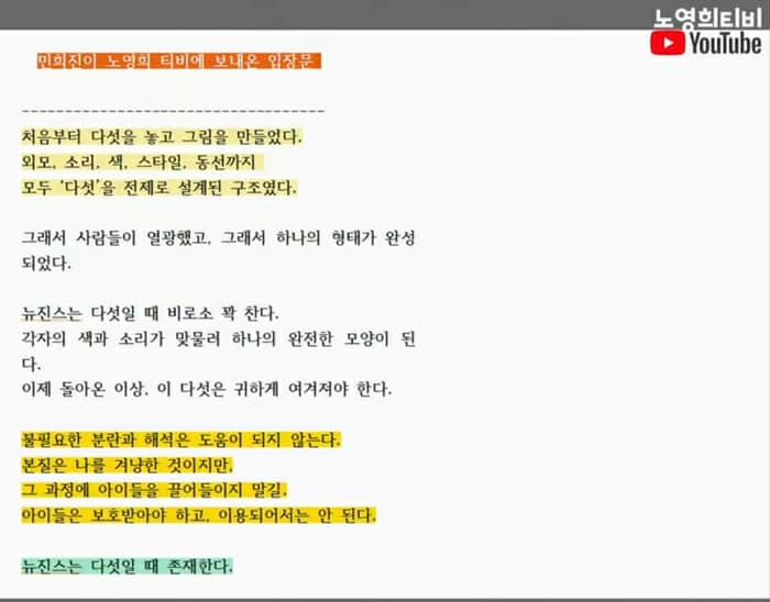 เมื่อวันที่ 15 ที่ผ่านมา บนช่องยูทูบ ‘โนยองฮีที TV’ มีการพูดถึงข้อพิพาททางกฎหมายของ NewJeans และ ADOR และได้เปิดเผยคำชี้แจงของมินฮีจินด้วย
