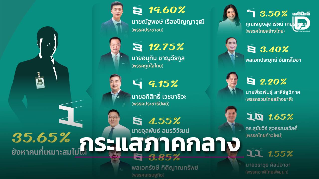 จากการสำรวจเมื่อถามถึงบุคคลที่คนภาคกลางจะสนับสนุนให้เป็นนายกรัฐมนตรีในวันนี้ พบว่า อันดับ 1 ร้อยละ 35.65 ระบุว่า ยังหาคนที่เหมาะสมไม่ได้ อันดับ 2 ร้อยละ 19.60 ระบุว่าเป็น นายณัฐพงษ์ เรืองปัญญาวุฒิ (พรรคประชาชน) อันดับ 3 ร้อยละ 12.75 ระบุว่าเป็น นายอนุทิน ชาญวีรกูล (พรรคภูมิใจไทย) อันดับ 4 ร้อยละ 9.15 ระบุว่าเป็น นายอภิสิทธิ์ เวชชาชีวะ (พรรคประชาธิปัตย์) อันดับ 5 ร้อยละ 4.55 ระบุว่าเป็น นายจุลพันธ์ อมรวิวัฒน์ (พรรคเพื่อไทย) อันดับ 6 ร้อยละ 3.85 ระบุว่าเป็น พลเอกรังษี กิติญาณทรัพย์ (พรรคเศรษฐกิจ) อันดับ 7 ร้อยละ 3.50 ระบุว่าเป็น คุณหญิงสุดารัตน์ เกยุราพันธุ์ (พรรคไทยสร้างไทย) อันดับ 8 ร้อยละ 3.40 ระบุว่าเป็น พลเอกประยุทธ์ จันทร์โอชา อันดับ 9 ร้อยละ 2.20 ระบุว่าเป็น นายพีระพันธุ์ สาลีรัฐวิภาค (พรรครวมไทยสร้างชาติ) อันดับ 10 ร้อยละ 1.65 ระบุว่าเป็น ดร.สุชัชวีร์ สุวรรณสวัสดิ์ (พรรคไทยก้าวใหม่) อันดับ 11 ร้อยละ 1.55 ระบุว่าเป็น นายวราวุธ ศิลปอาชา (พรรคชาติไทยพัฒนา) ร้อยละ 1.50 ระบุอื่น ๆ ได้แก่ ดร.นฤมล ภิญโญสินวัฒน์ (พรรคกล้าธรรม) พลเอกประวิตร วงษ์สุวรรณ (พรรคพลังประชารัฐ) นายรังสิมันต์ โรม (พรรคประชาชน) พลโทบุญสิน พาดกลาง พันตำรวจเอกทวี สอดส่อง (พรรคประชาชาติ) นายวันมูหะมัดนอร์ มะทา (พรรคประชาชาติ) นางสาวซาบีดา ไทยเศรษฐ์ (พรรคภูมิใจไทย) นายจตุพร บุรุษพัฒน์ (พรรคโอกาสใหม่) นายชวน หลีกภัย (พรรคประชาธิปัตย์) และไม่ประสงค์ลงคะแนน (Vote No) และร้อยละ 0.65 ระบุว่า ไม่ตอบ/ไม่สนใจ