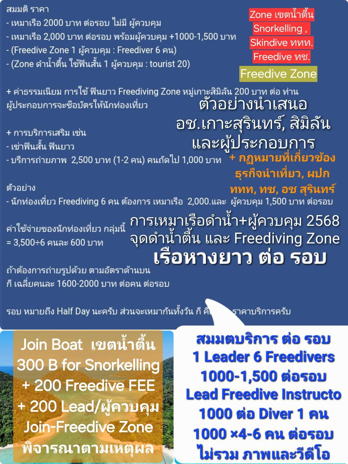 - นักท่องเที่ยว Freediving 6 คน ต้องการ เหมาเรือ 2,000.และ ผู้ควบคุม 1,500 บาท ต่อรอบ