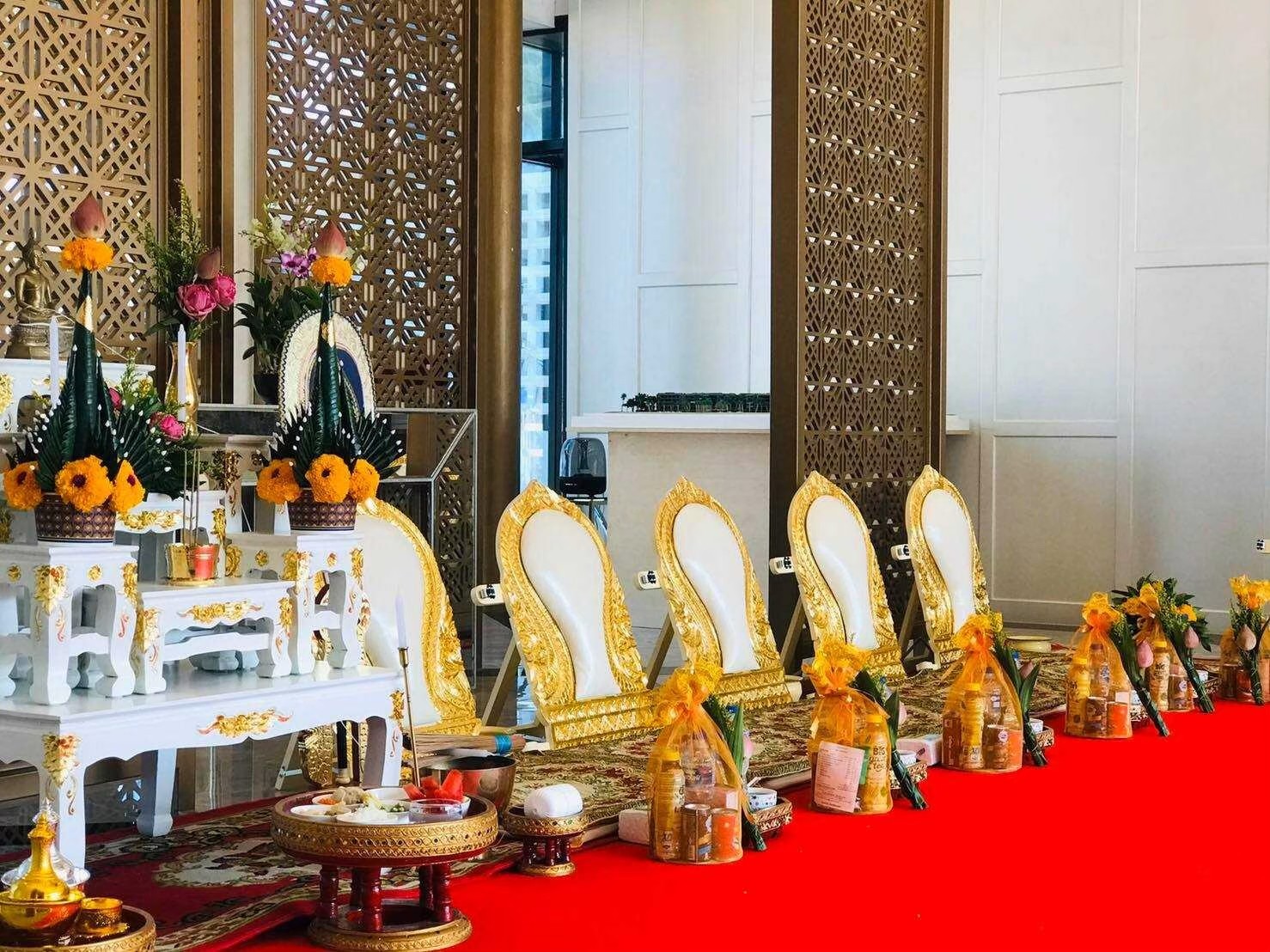 A: สามารถจัดได้ 100% เพราะบริการของเรามีทั้งอุปกรณ์พิธี โต๊ะ เก้าอี้ พรมดอกไม้ และอาหารครบชุด ลูกค้าไม่จำเป็นต้องเตรียมเอง