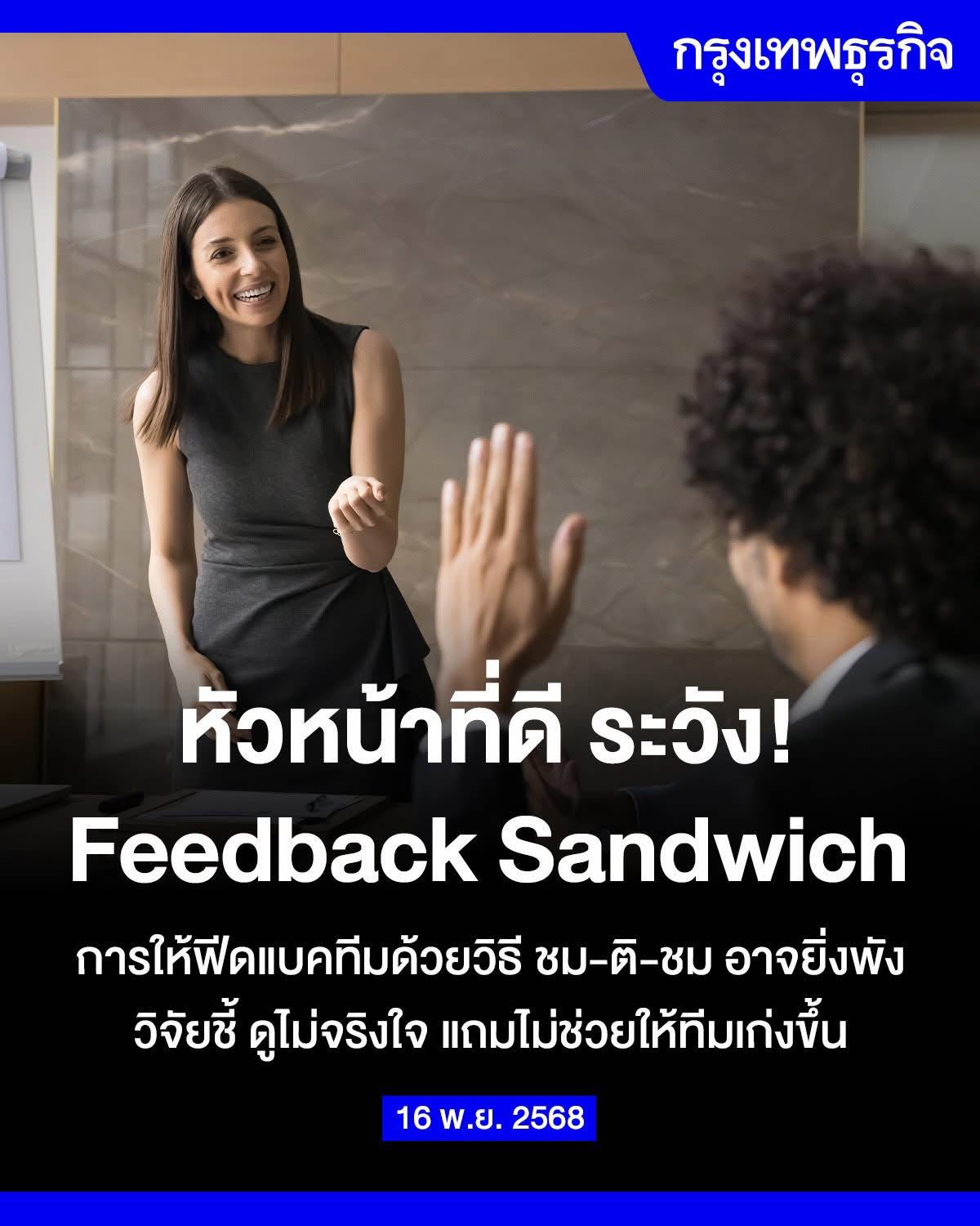 การให้ฟีดแบ็กแบบ “ให้คำชมก่อน ตามด้วยคำวิจารณ์ให้ปรับปรุง แล้วปิดท้ายด้วยคำชมอีกครั้ง” คือนิยมของคำว่า Feedback Sandwich ซึ่งเป็นหนึ่งในเทคนิคที่ถูกสอนกันมาเป็นสิบปีคือ เพื่อให้คำวิจารณ์ฟังดูเบาลง ลดแรงเสียดทาน และช่วยให้บทสนทนาฟังแล้วดูเป็นมิตรมากขึ้น แต่ปัญหาคือ…มันไม่ได้ผลอย่างที่หวัง!