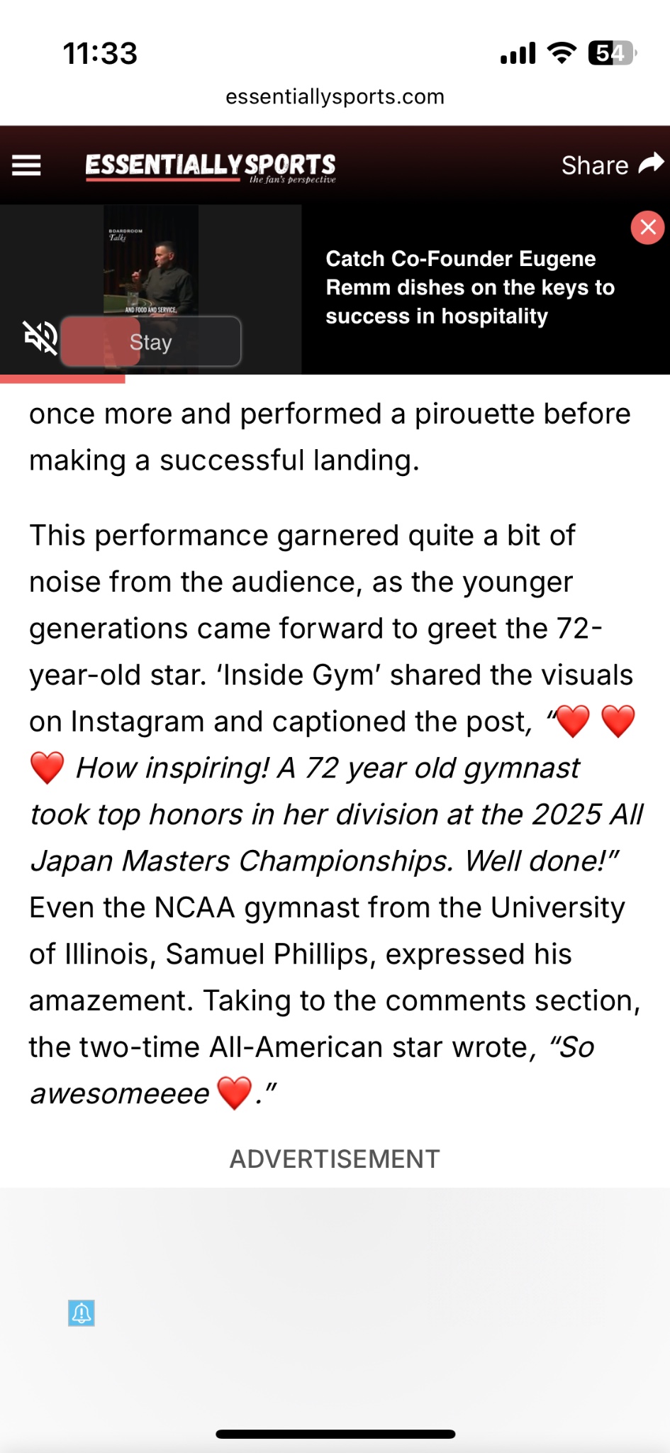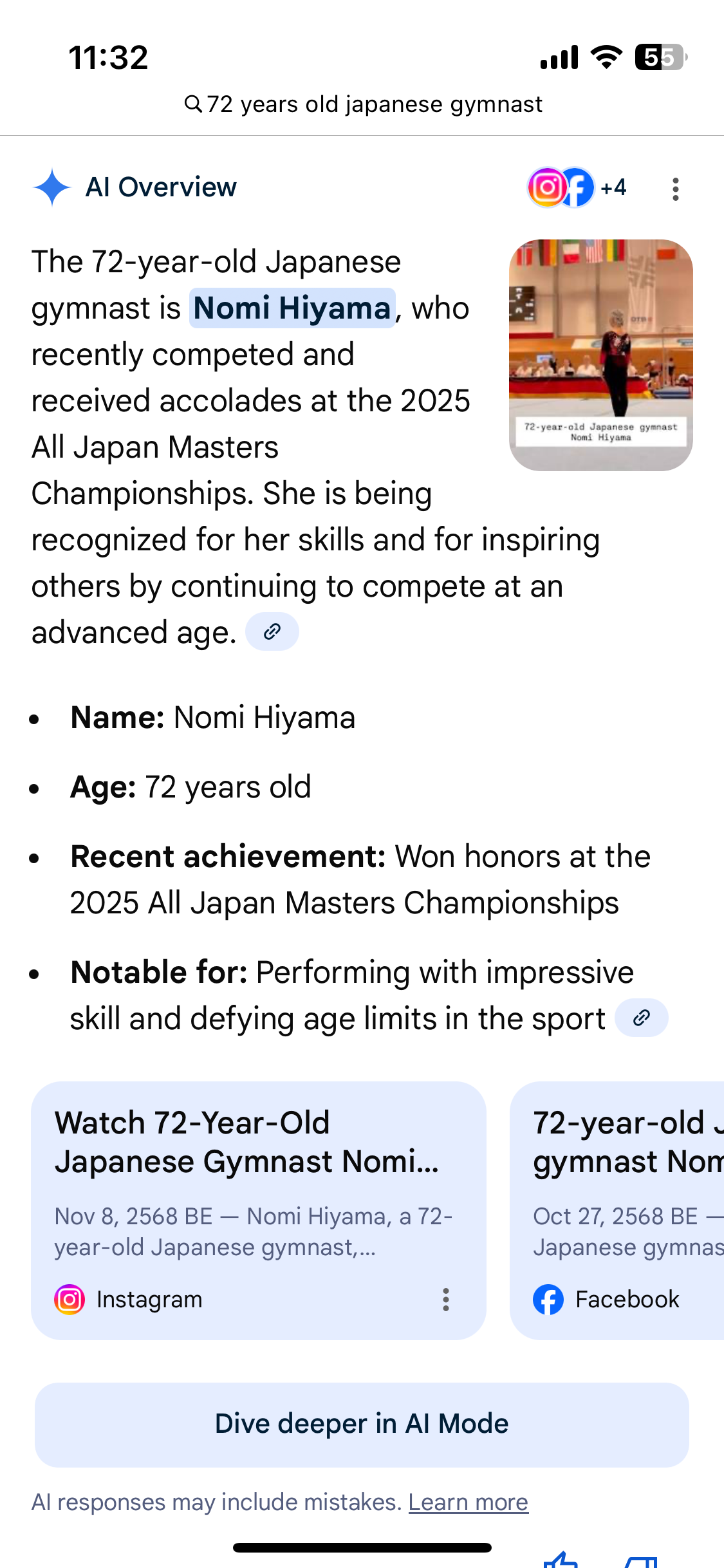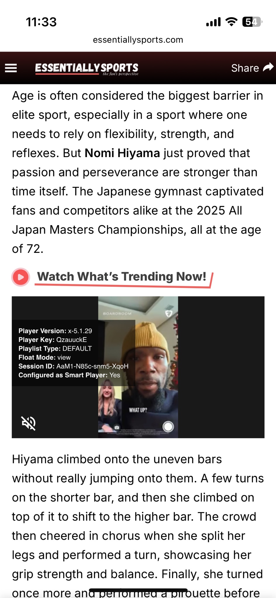 ตอนนี้ Nomi Hiyama นักยิมนาสติกหญิงวัยดึกอายุ 72 ปีกลายเป็นไวรัลไปทั่วโลกในตอนที่เธอแข่งขันในรายการ All Japan Masters Artistic Gymnastics Championships ซึ่งเธอได้โชว์ทักษะยิมนาสติกของเธอให้เห็นว่า คนอายุมากก็ยังมีความยอดเยี่ยมในกีฬายิมนาสติกได้ โดยตัวเธอให้สัมภาษณ์ว่า ต้องการที่จะเล่นยิมนาสติกให้มีความสุขแค่นั้น แต่ไม่คิดว่าจะกลายเป็นข่าวโด่งดังไปทั่วโลก โดยเจ้าตัวได้คะแนนความยากของท่า คะแนนความสมบูรณ์แบบของท่า รวมทั้งคะแนนความสวยงามของท่าเป็นอันดับที่หนึ่งในรุ่นอายุของตัวเอง โดยตอนนี้เธอถือเป็นปรากฏการณ์ที่น่าทึ่งในวงการยิมนาสติกโลกไปแล้ว ไม่ใช่แค่ในญี่ปุ่นเท่านั้น ซึ่งเป็นอะไรที่น่าตกใจมากครับสำหรับคนอายุ 72 ปีที่สามารถทำได้ขนาดนี้