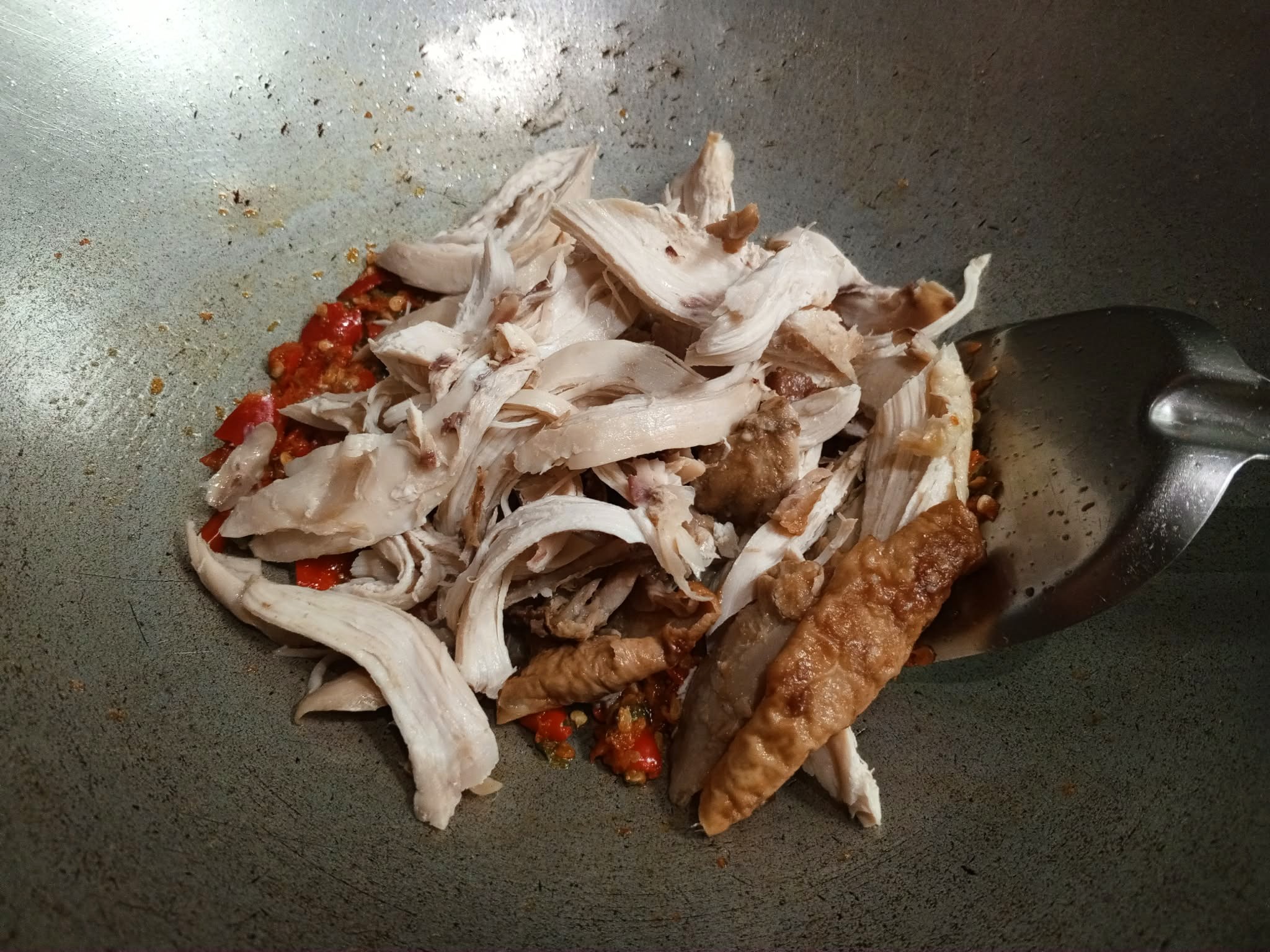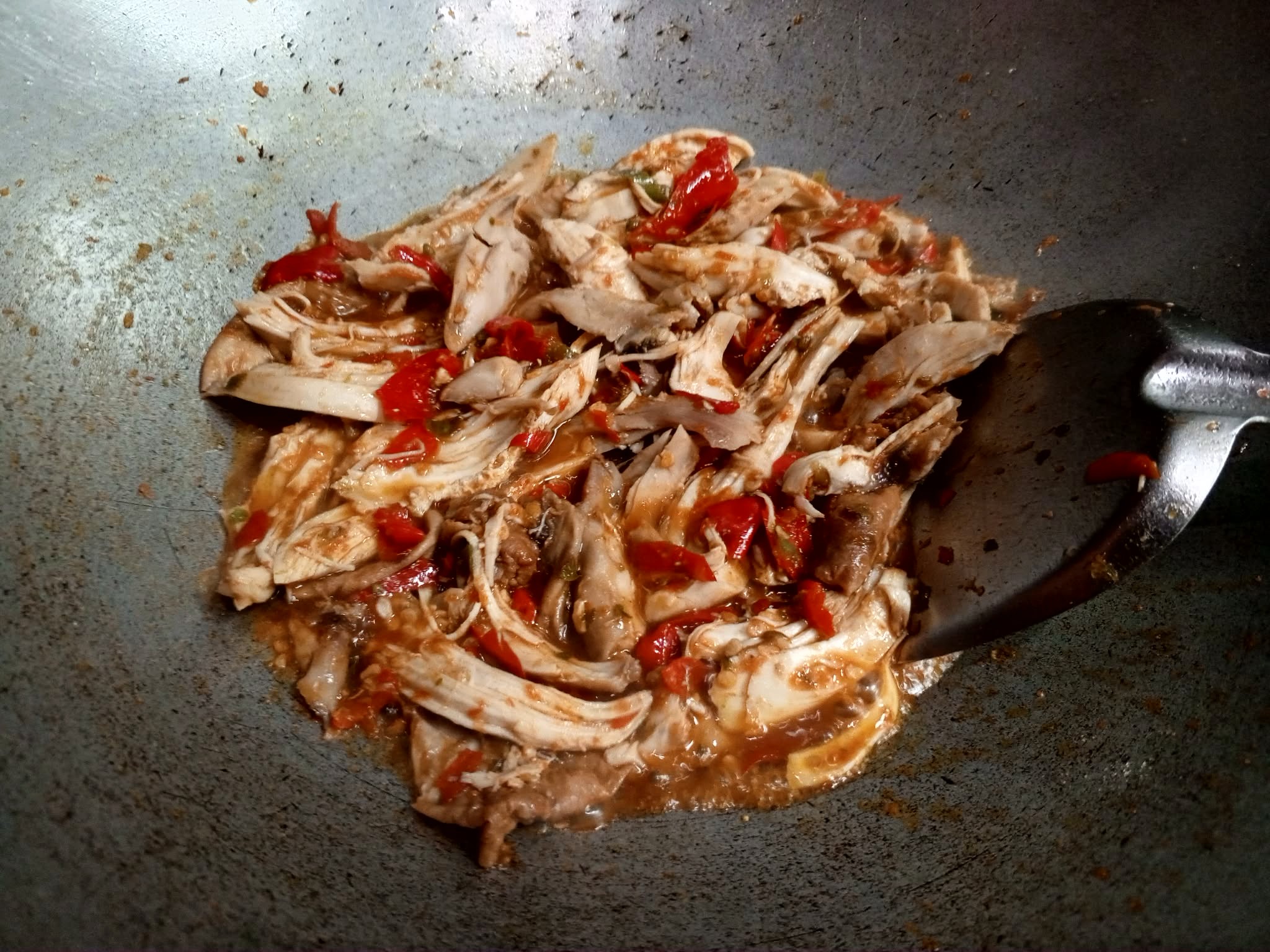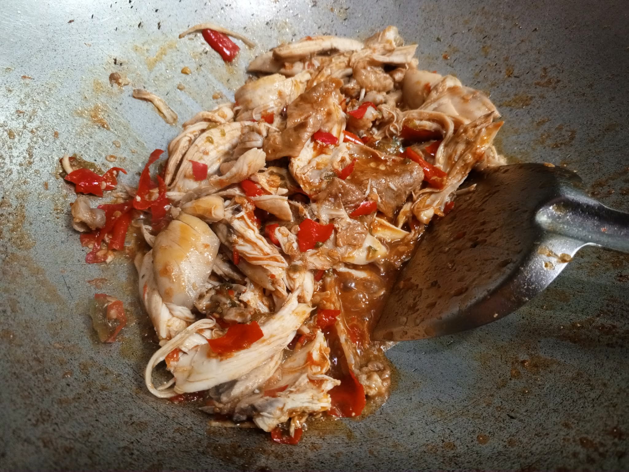 จากนั้นใส่ไก่ย่างที่เราแกะเนื้อลงผัด