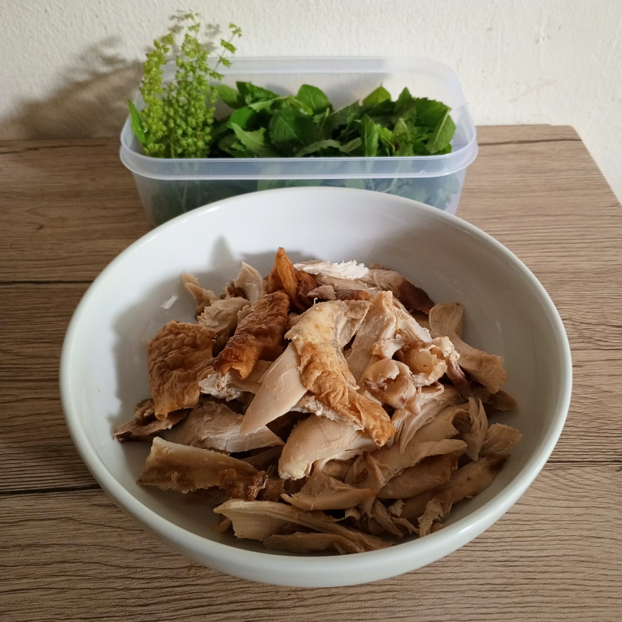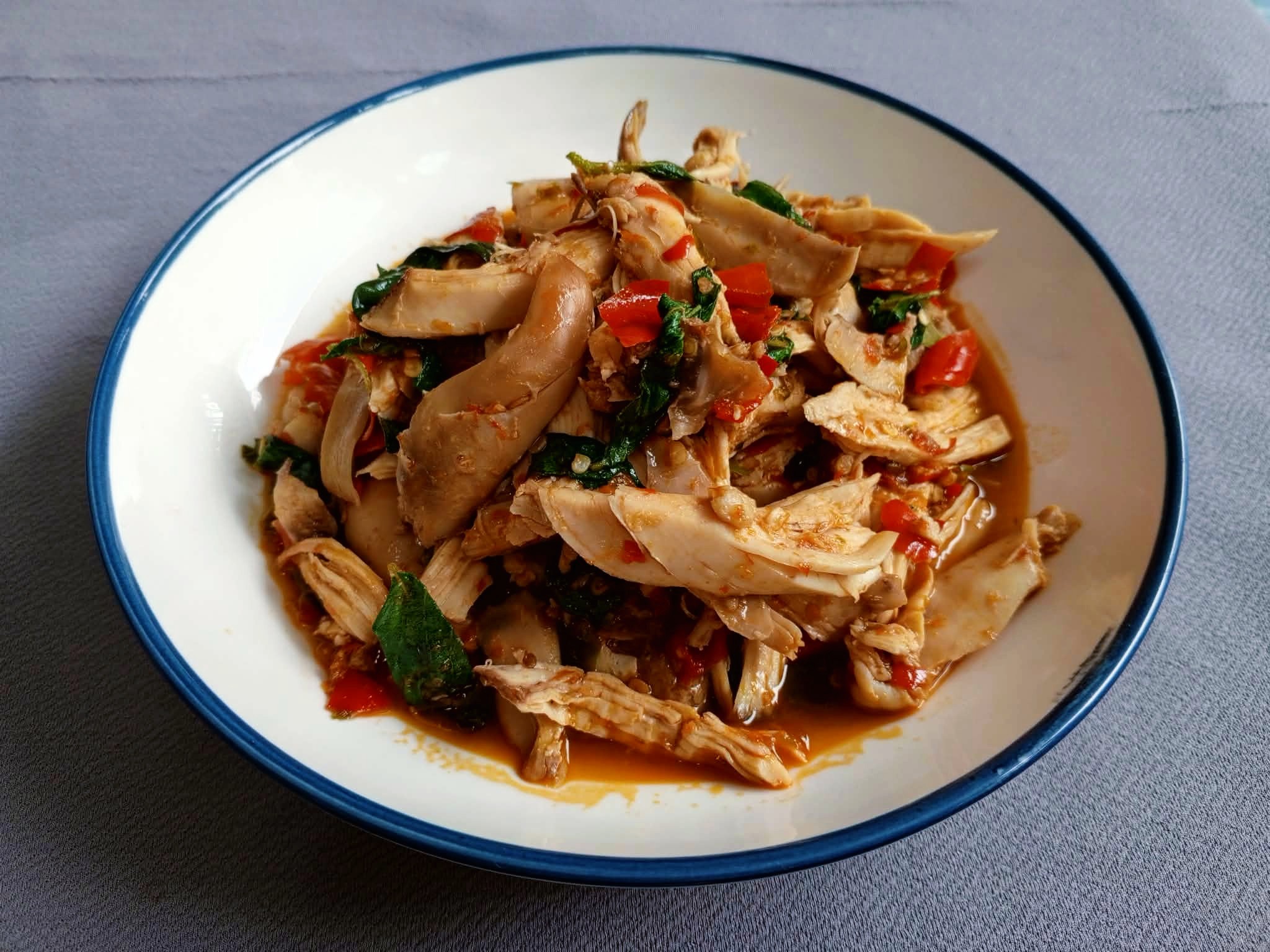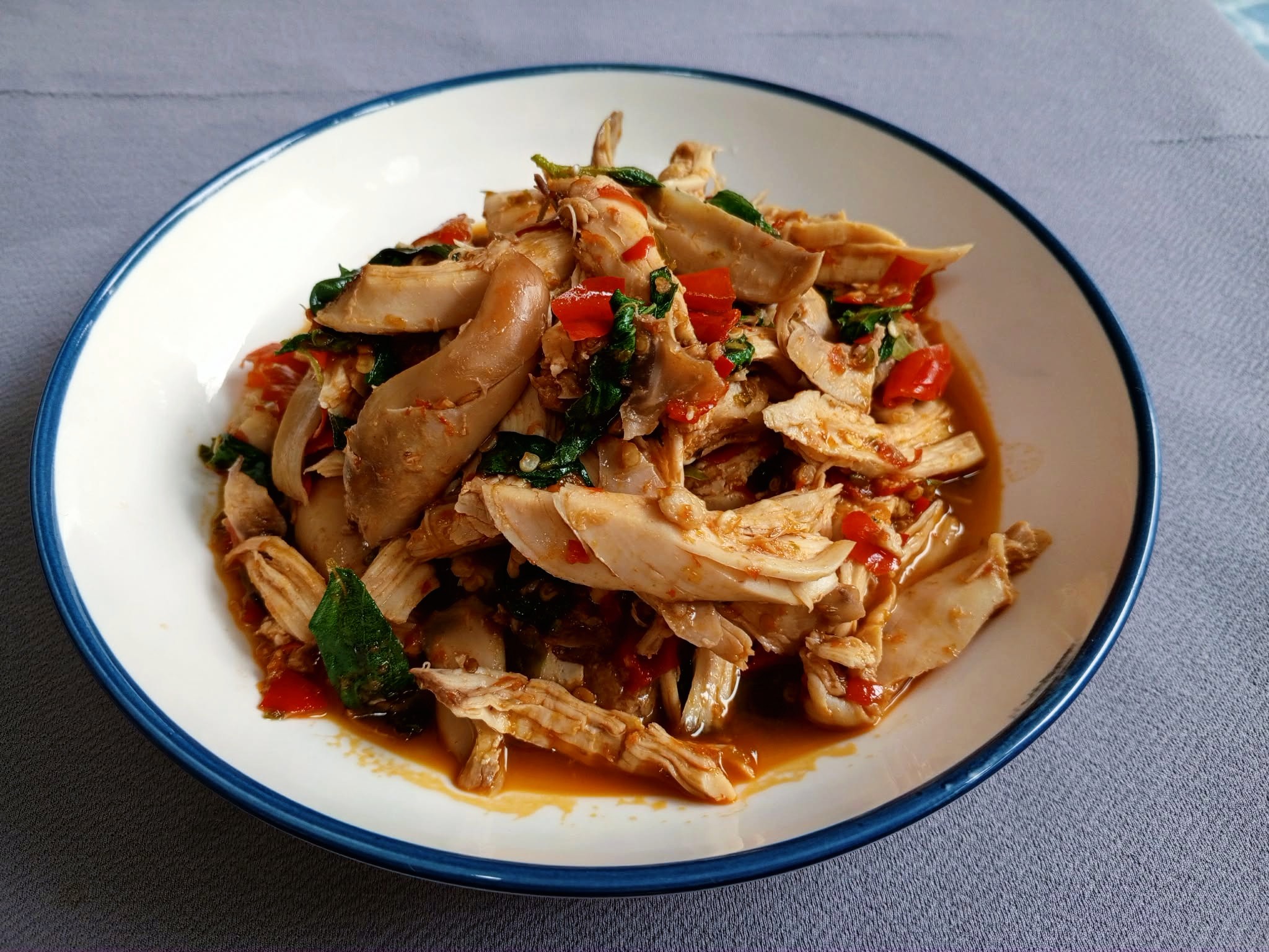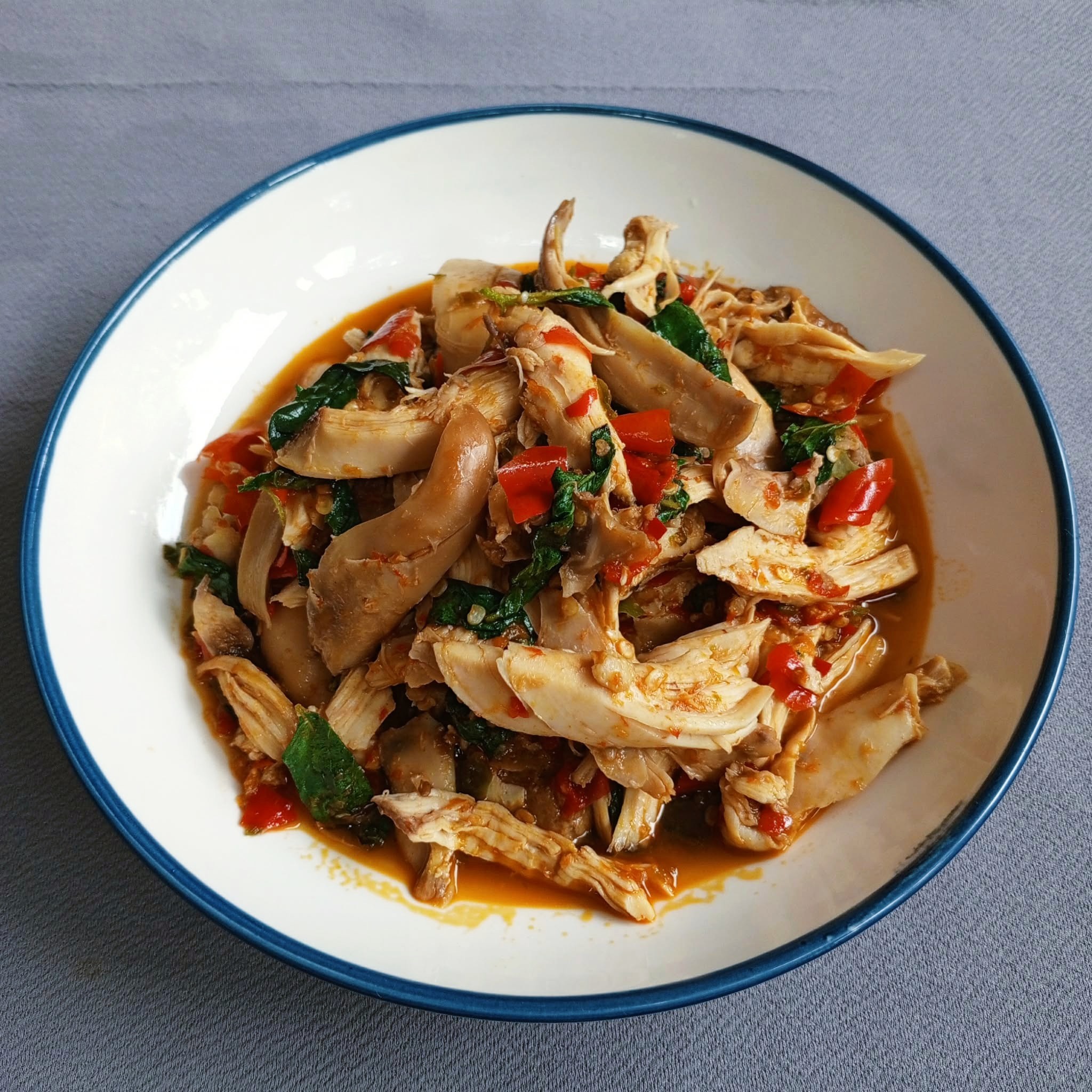 จากนั้นใส่ไก่ย่างที่เราแกะเนื้อลงผัด