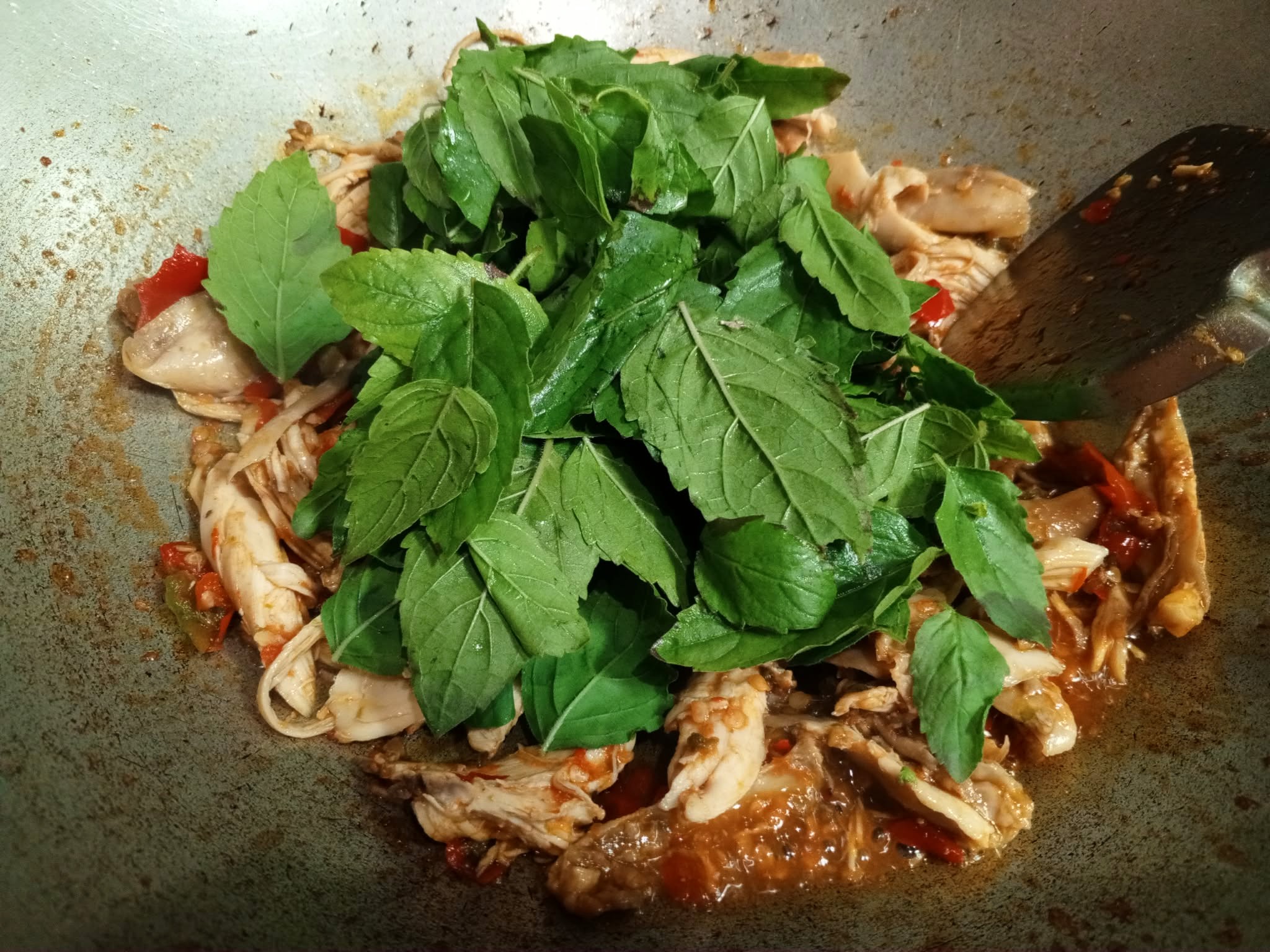 สุดท้ายใส่ใบกะเพราปิดท้าย เป็นอันเสร็จค่ะ