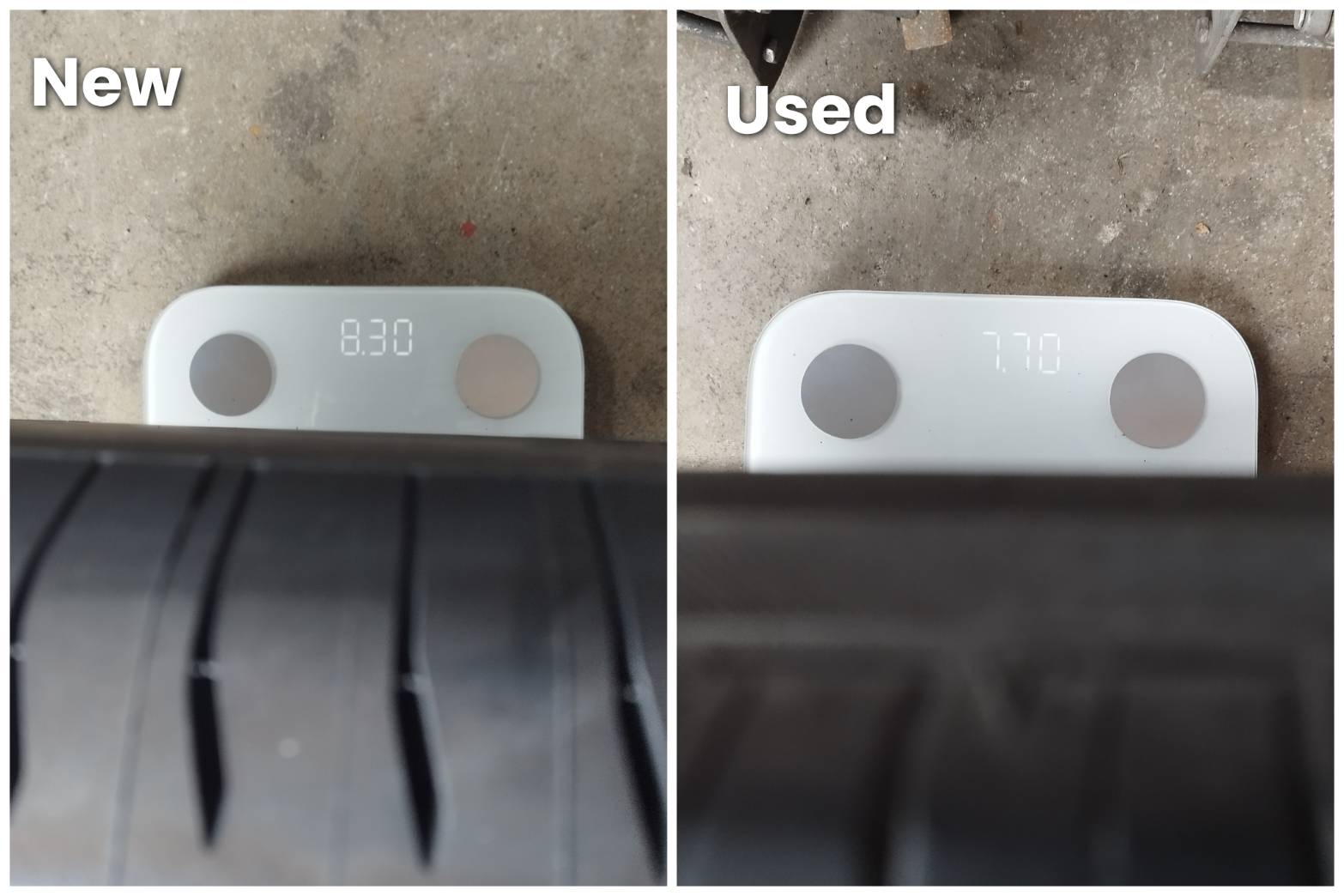 รูป - เปรียบเทียบน้ำหนักยางที่หายไป ตอนใหม่ๆ กับหลังใช้งานมา 15 เดือน 54,000+ กม. 8.30 -> 7.70 หายไป 0.60 กก. ถือว่าหายไปเยอะเลยนะครับ