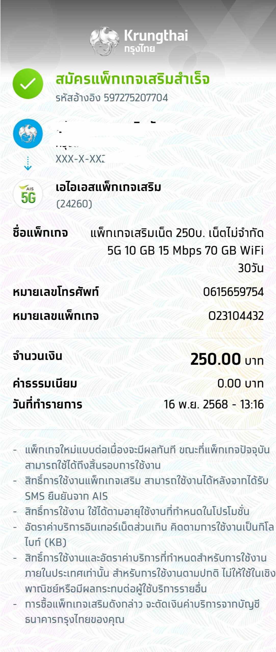 สวัสดีครับ พอดีมีเรื่องสงสัยเกี่ยวกับโปรเน็ต ais แบบเติมเงิน ปกติผมใช้โปรเน็ต 10mbps 200 บาทไม่ลดสปีดแต่เหมือนว่าจะโดนยกเลิกในรอบเดือนถัดไป คือ ธค 68 พร้อมกับเปลี่ยนเป็นโปรใหม่ให้คือ 250 บาทได้เน็ต 10
