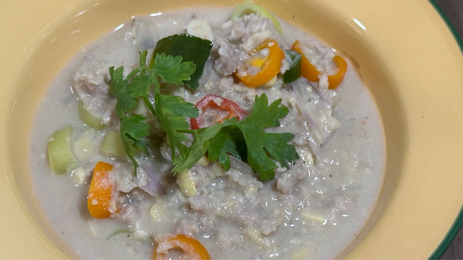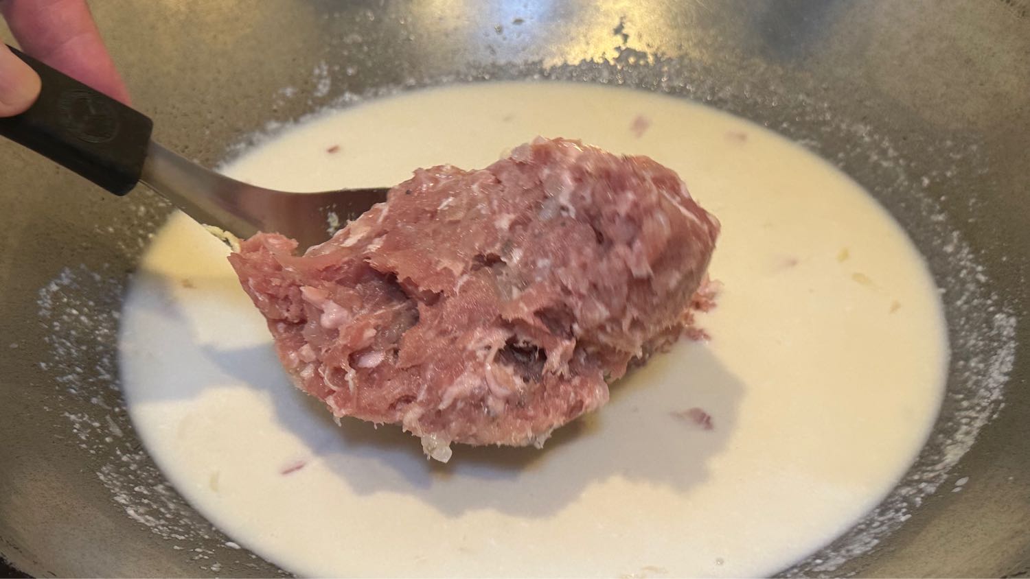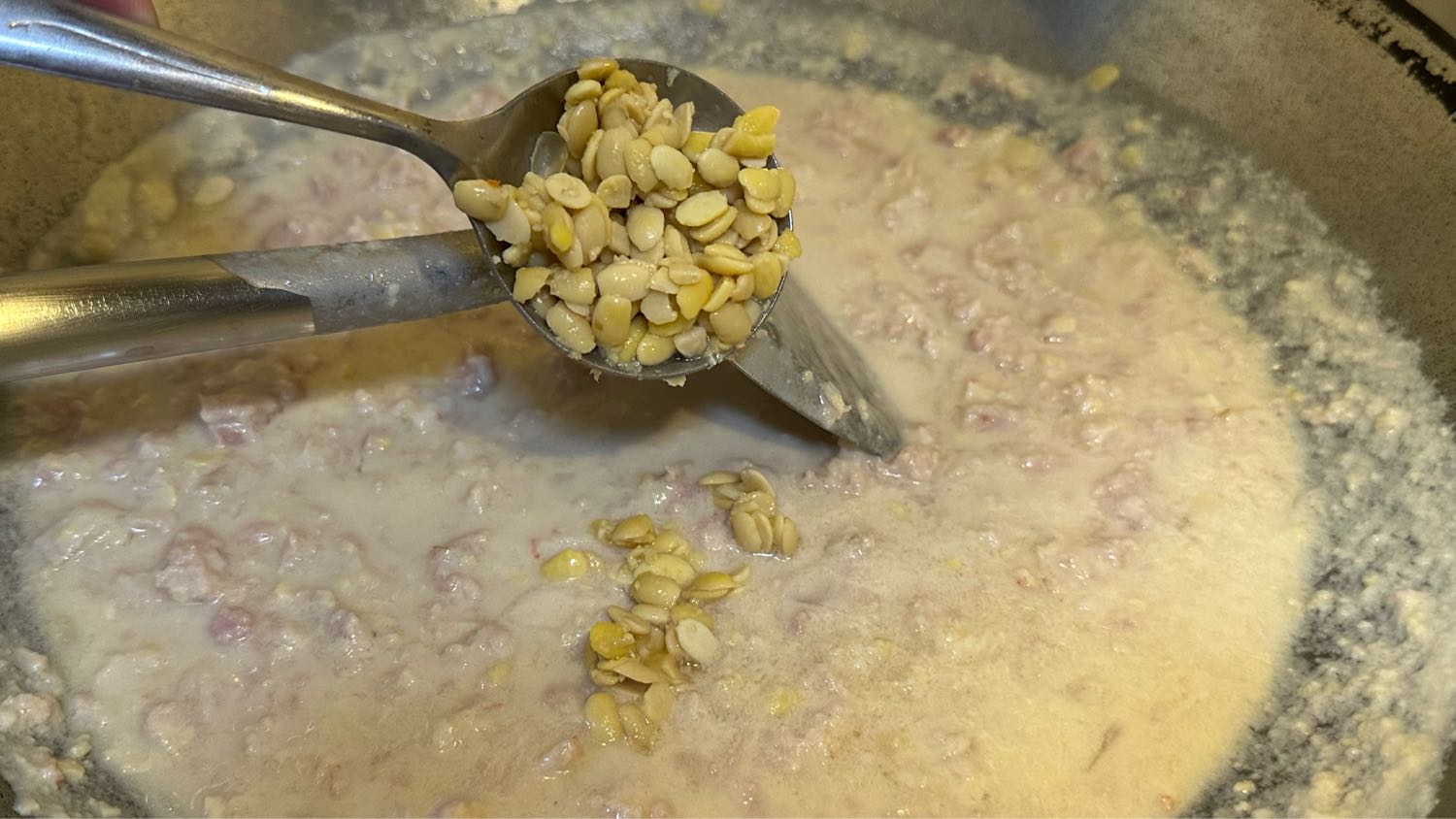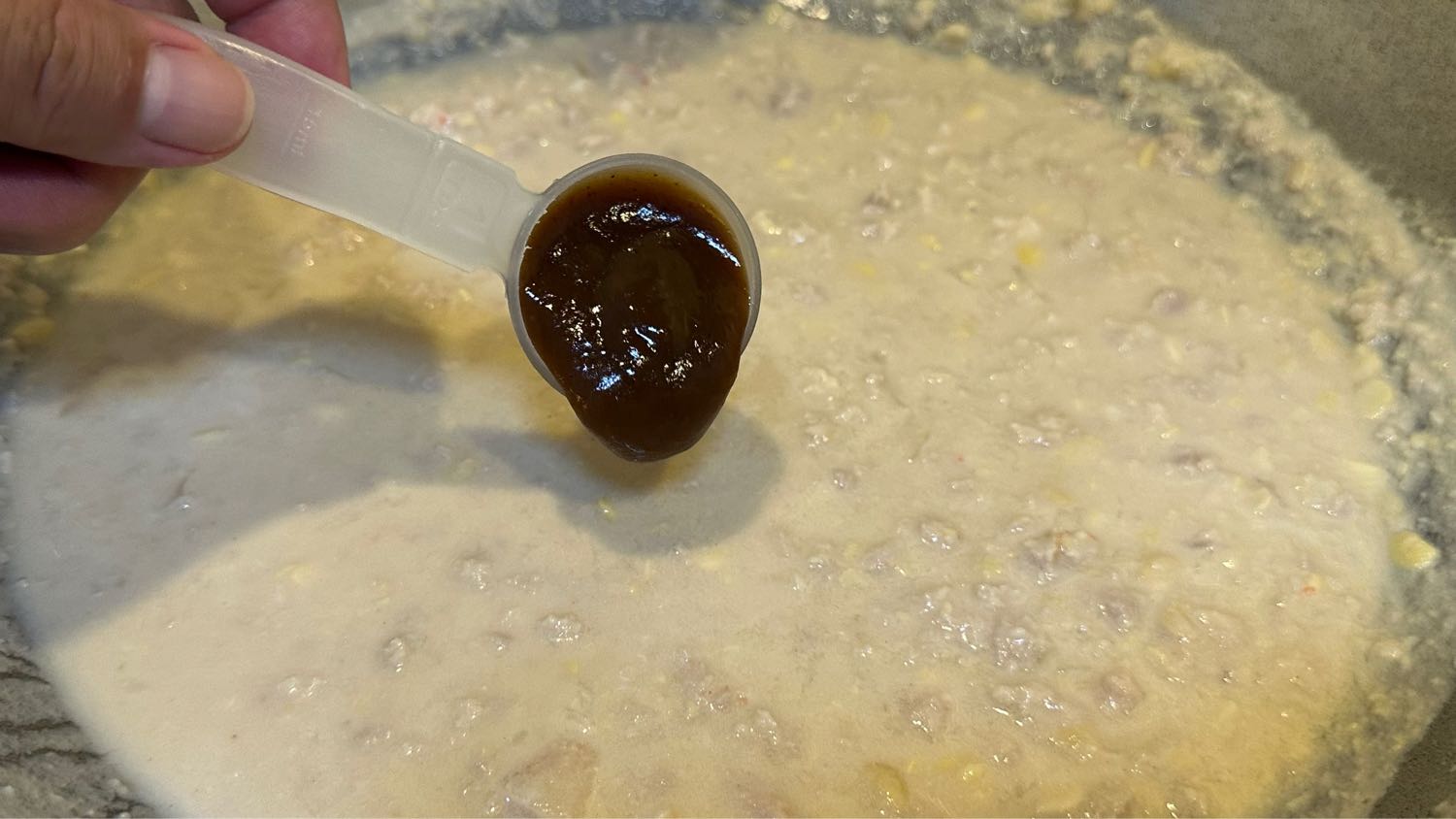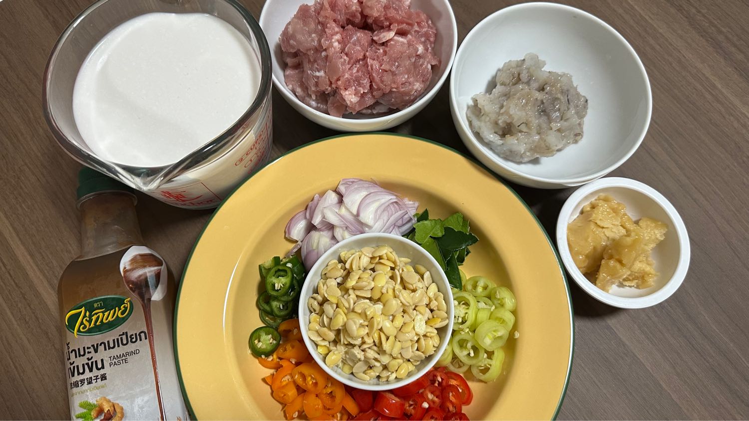 4.ใส่น้ำกะทิทั้งหมดลงในกระทะใช้ไฟกลาง พอกะทิร้อน(ไม่เคี่ยวให้แตกมัน) ใส่เต้าเจี้ยวที่ตำไว้ลงไป คนให้เข้ากัน จากนั้นเติมหมูสับผสมกุ้งลงไปยีให้หมูกระจายไม่จับตัวเป็นก้อน จากนั้นเติมเต้าเจี้ยวเม็ดที่แบ่งไว้ลงไป คนไปจนหมูสุก