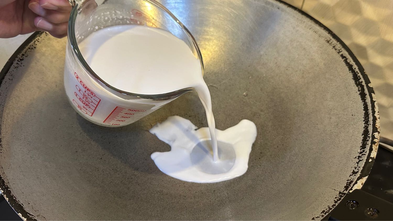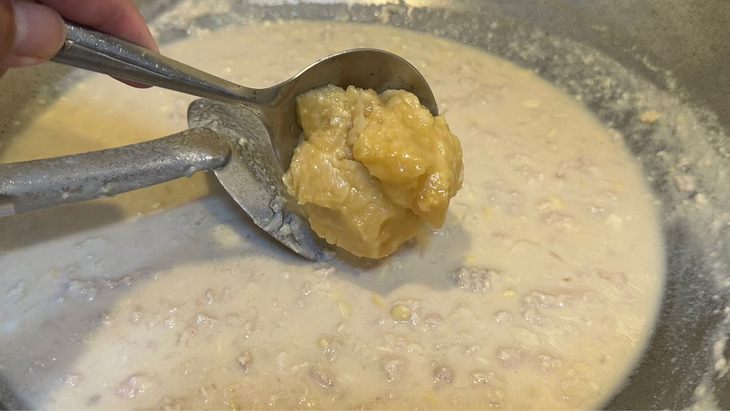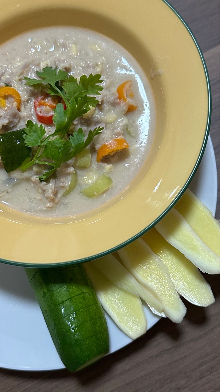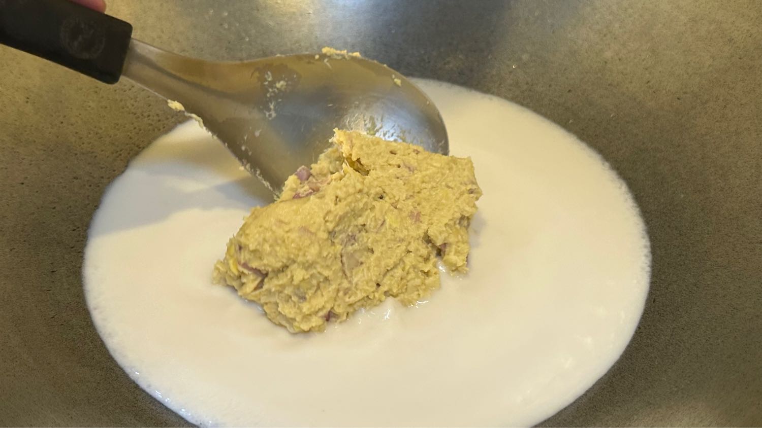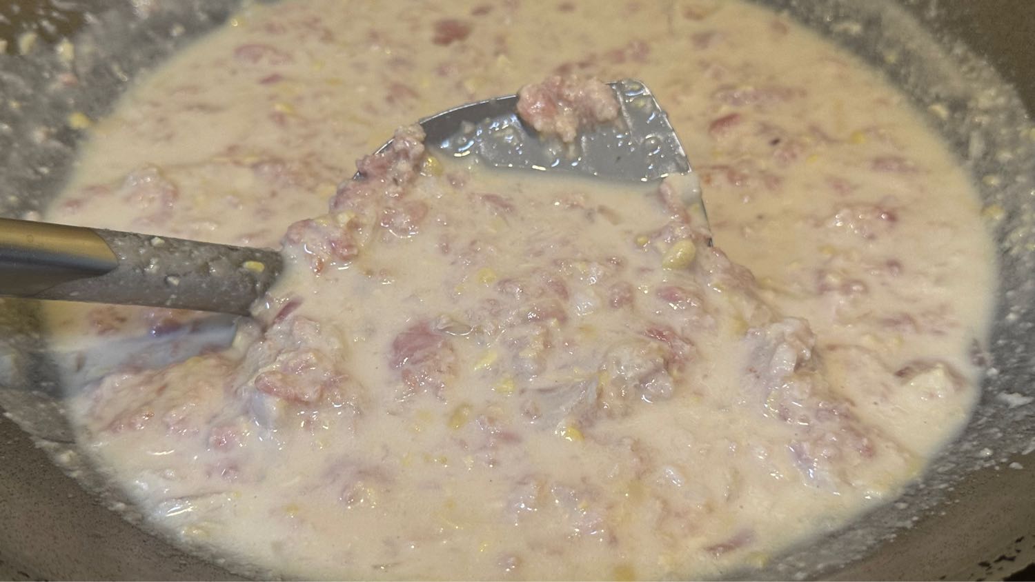 4.ใส่น้ำกะทิทั้งหมดลงในกระทะใช้ไฟกลาง พอกะทิร้อน(ไม่เคี่ยวให้แตกมัน) ใส่เต้าเจี้ยวที่ตำไว้ลงไป คนให้เข้ากัน จากนั้นเติมหมูสับผสมกุ้งลงไปยีให้หมูกระจายไม่จับตัวเป็นก้อน จากนั้นเติมเต้าเจี้ยวเม็ดที่แบ่งไว้ลงไป คนไปจนหมูสุก