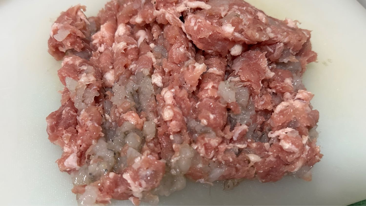 2.นำหมูสับ กุ้งสับ ที่สับแล้วมาสับหรือคลุกผสมรวมกันพักไว้