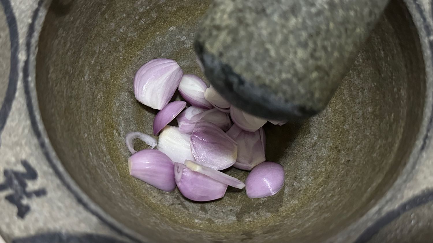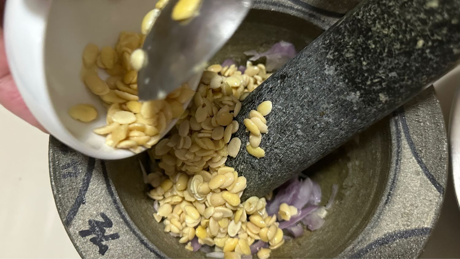 3.แบ่งหอมซอยประมาณครึ่งนึง นำมาตำพอแหลก ใส่เต้าเจี้ยวขาวที่เตรียมไว้ลงไป (แบ่งเต้าเจี้ยวเม็ดไว้สัก 2 ช้อนโต๊ะ ไม่ต้องเอาไปตำ) ตำเต้าเจี้ยวกับหอมแดงให้ละเอียดเข้ากัน ตักพักไว้
