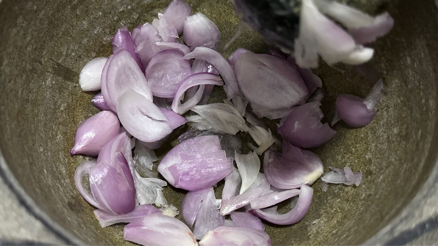 -หอมแดงซอย 10 หัว หรือประมาณ 1/2 ถ้วยตวง