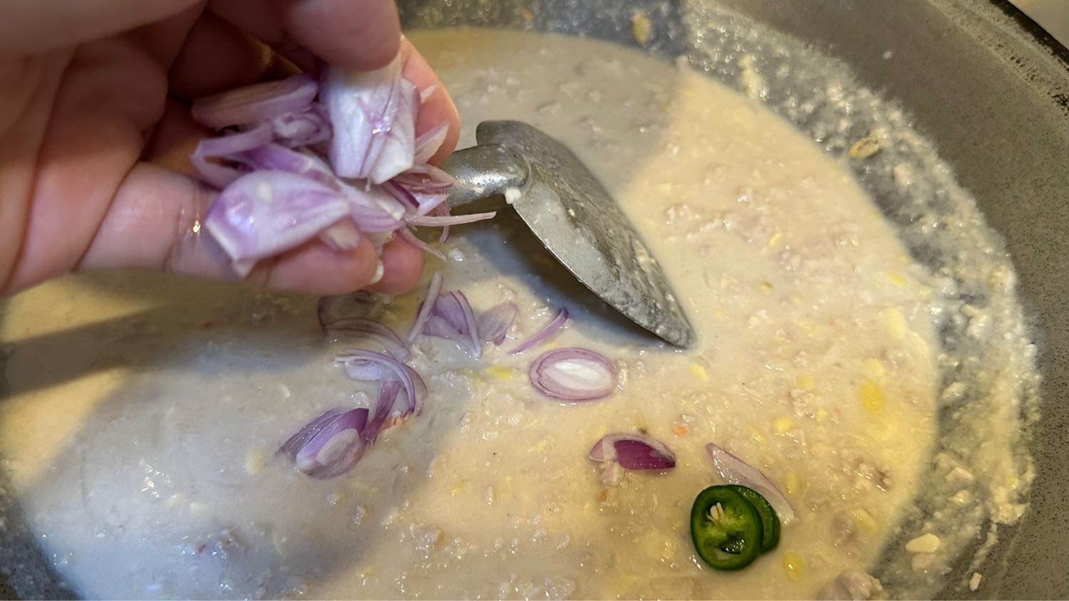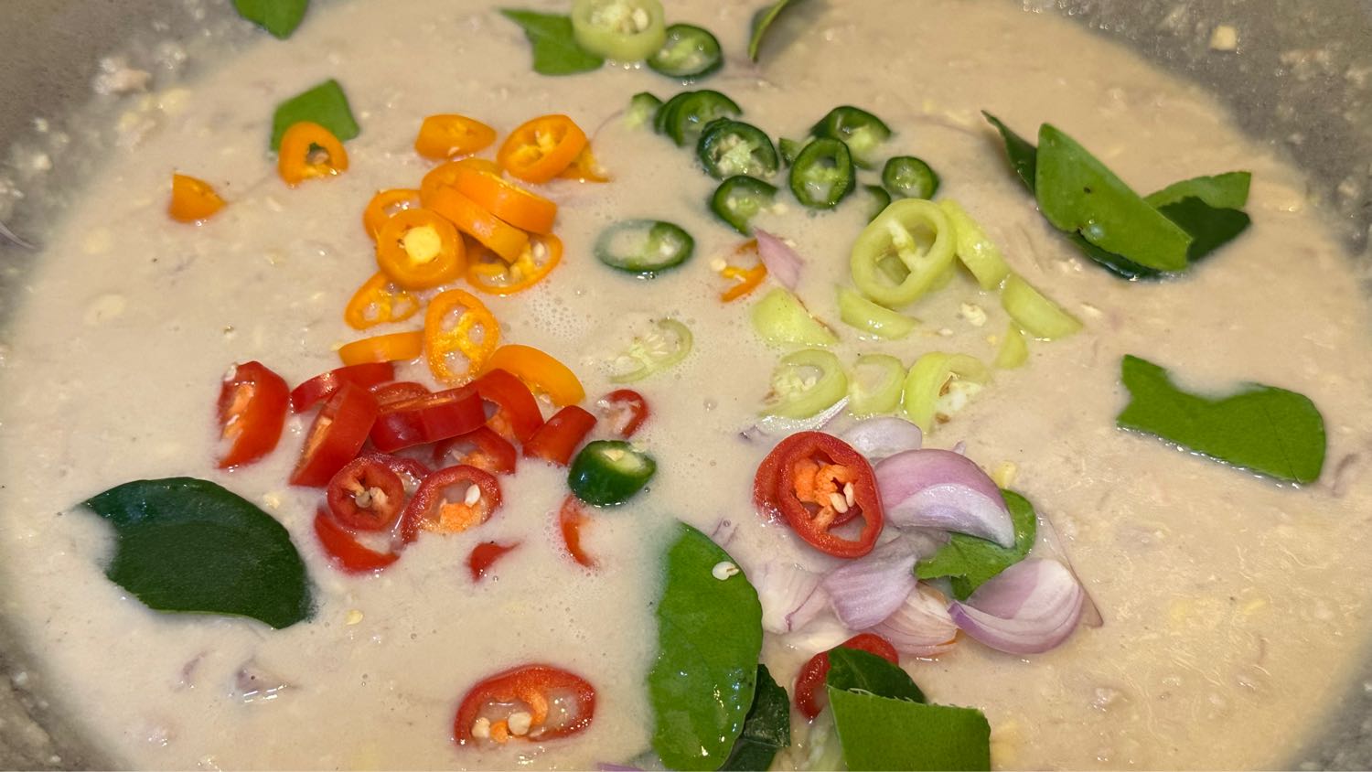 6.เติมหอมแดง พริกชี้ฟ้า ใบมะกรูดลงไป คนให้เข้ากัน เร่งไฟ พอเดือด ยกลงจากเตา พร้อมตักเสริฟ
