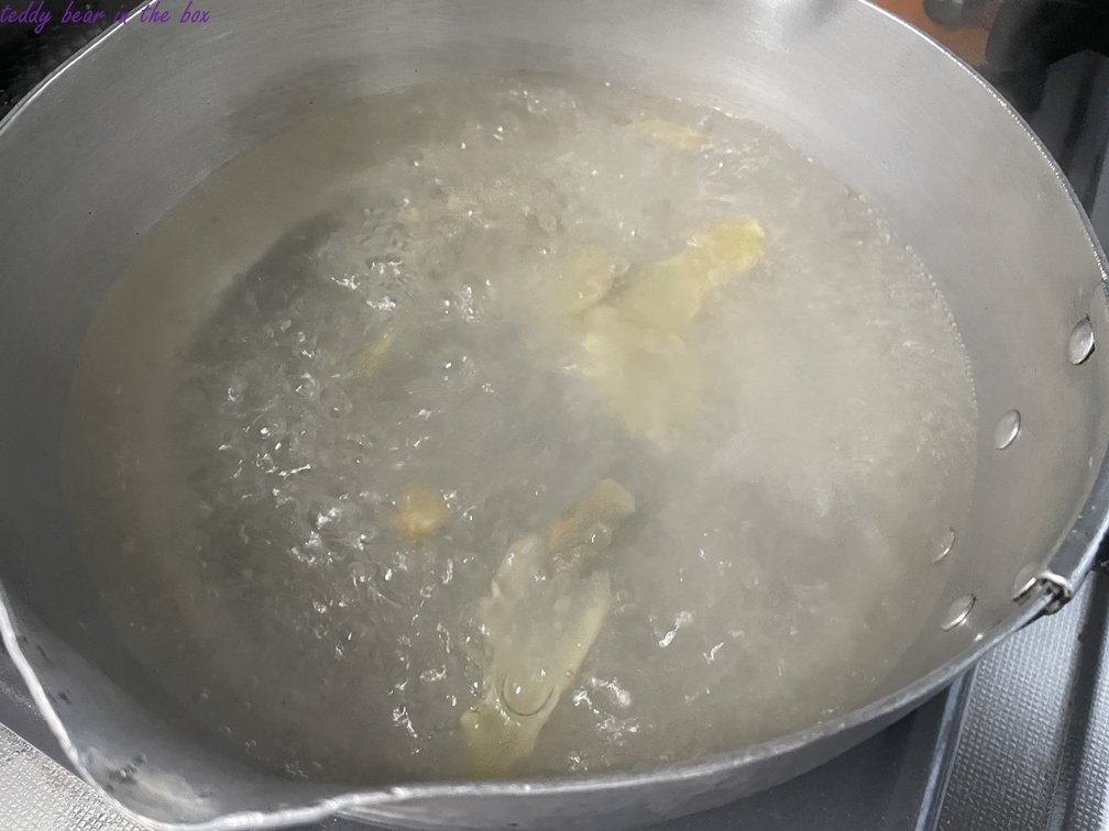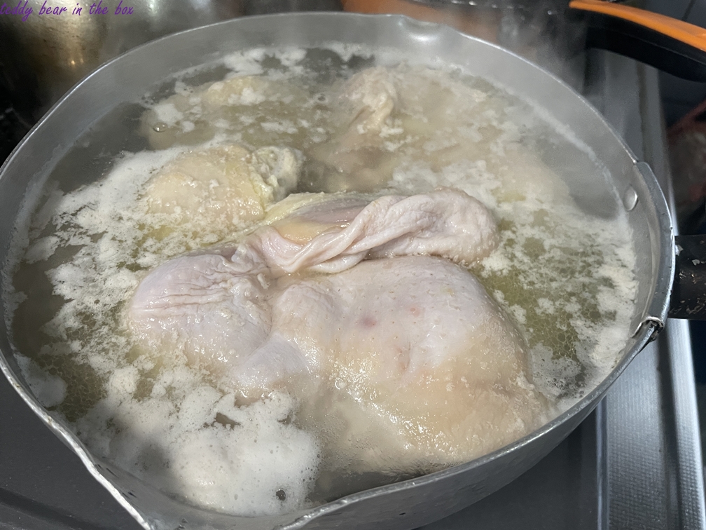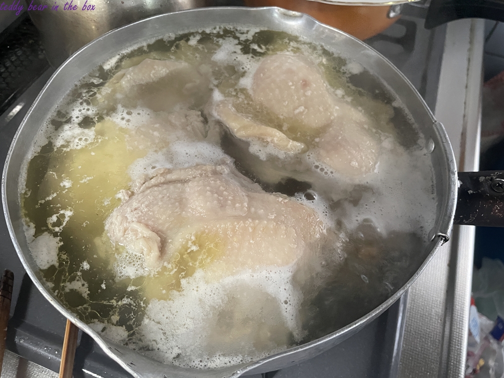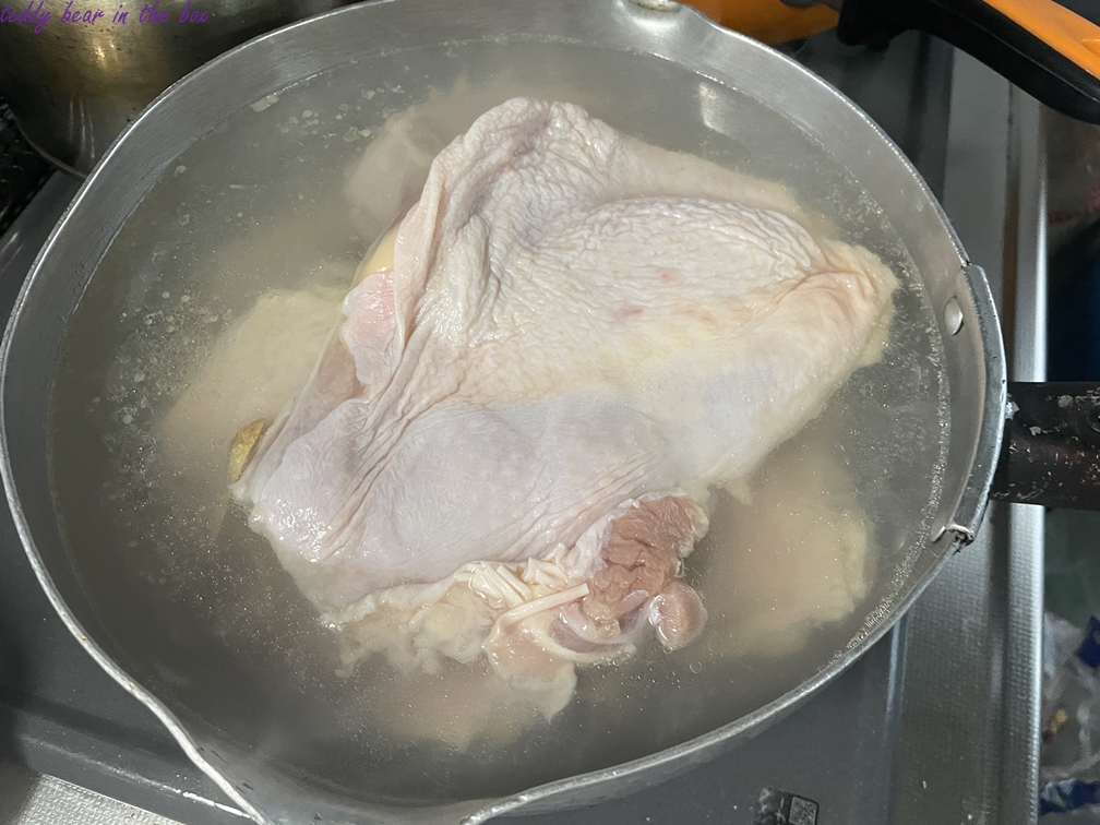 ต้มน้ำกับขิงฝานบางๆ ใส่เกลือ 1 ชต พอเดือดแล้วใส่ไก่ลงต้ม