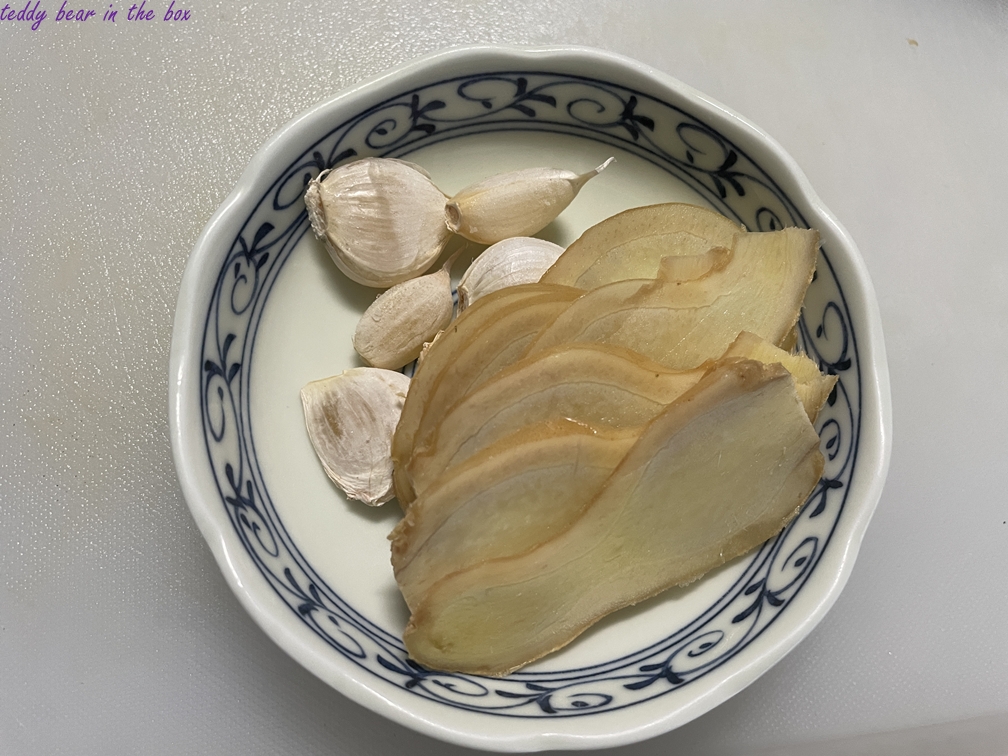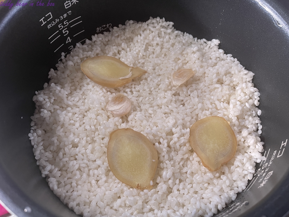 ใส่ข้าว กระเทียมและขิงฝานที่เหลือ