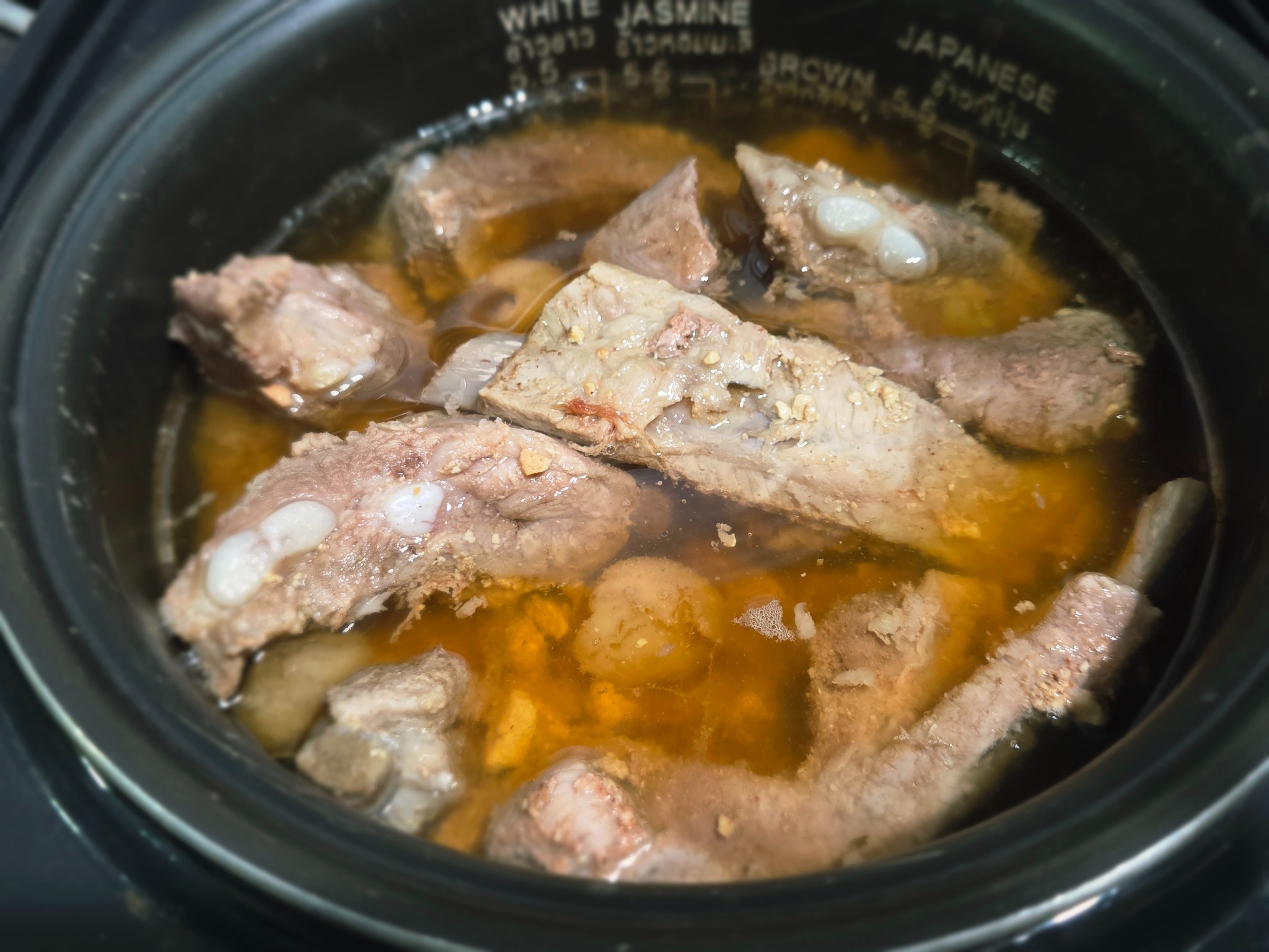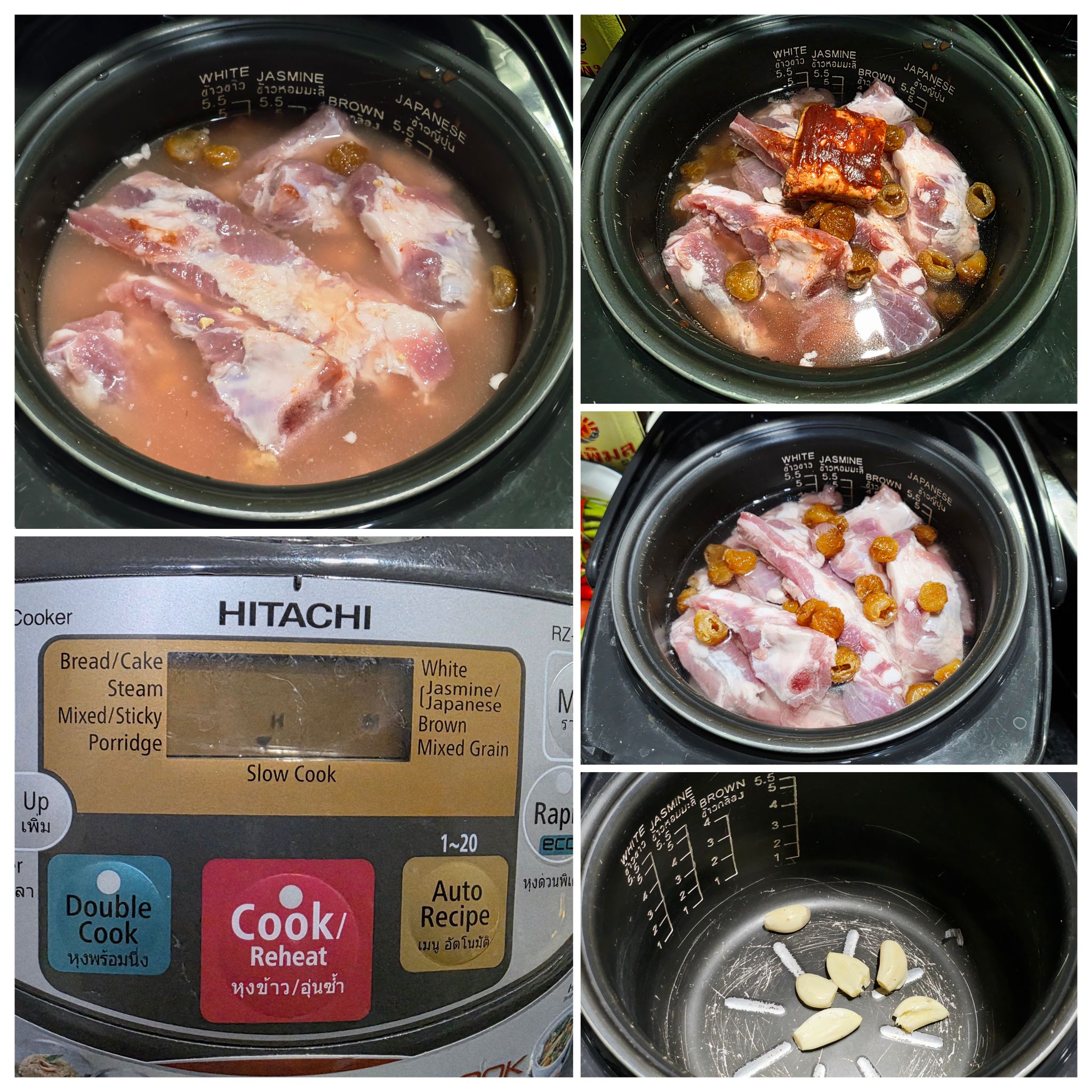 ตั้งหมวดตุ๋น สัก 1 ชั่วโมงครึ่ง สำหรับหม้อหุงข้าว ที่ผมใช้ (อาจต้องดูในคู่มือ หม้อหุงข้าวแต่ละยี่ห้อ)