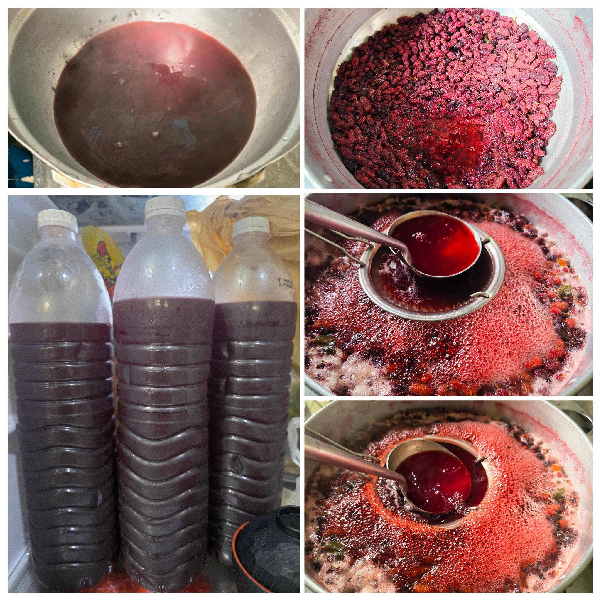 ปิดท้ายด้วย เครื่องดื่ม น้ำหม่อน ที่ปลูกเอง เอามาต้มใส่น้ำตาลทรายแดงหรือน้ำตาลกรวดนิดหน่อย หวานนอ่อนๆ แช่เย็นๆ ชื่นใจมากครับ