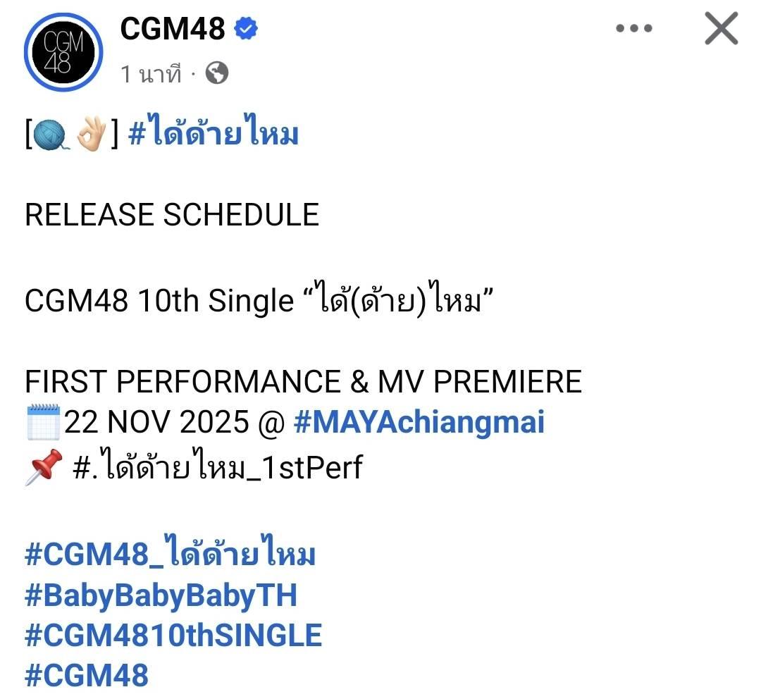 งานเปิดตัวซิงเกิลที่ 10 ของวง CGM48 เพลงออริจินัล "ได้ (ด้าย) ไหม" ในวันเสาร์ที่ 22 พฤศจิกายน 2568 ประกาศแล้วว่าจะเปิดตัวที่ห้างเมญ่า เชียงใหม่ ซึ่งงานเปิดตัวครั้งนี้อย่างที่หลายคนทราบกัน จะ