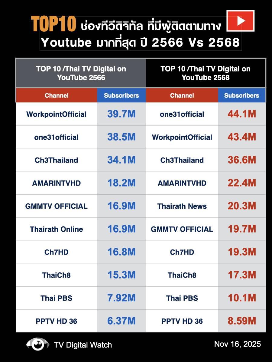 เปิด 10 อันดับแรกช่องทีวีดิจิทัลที่มีสมาชิก YouTube มากที่สุด