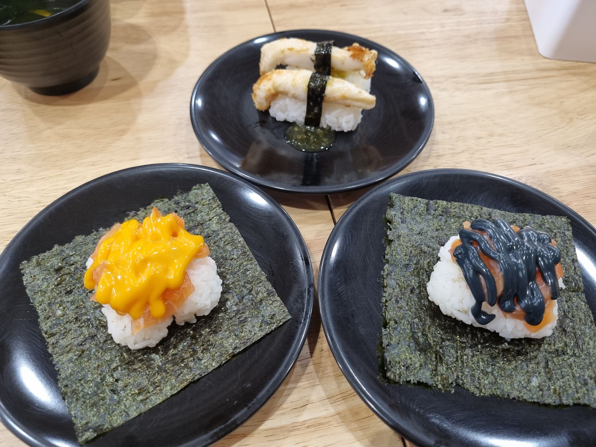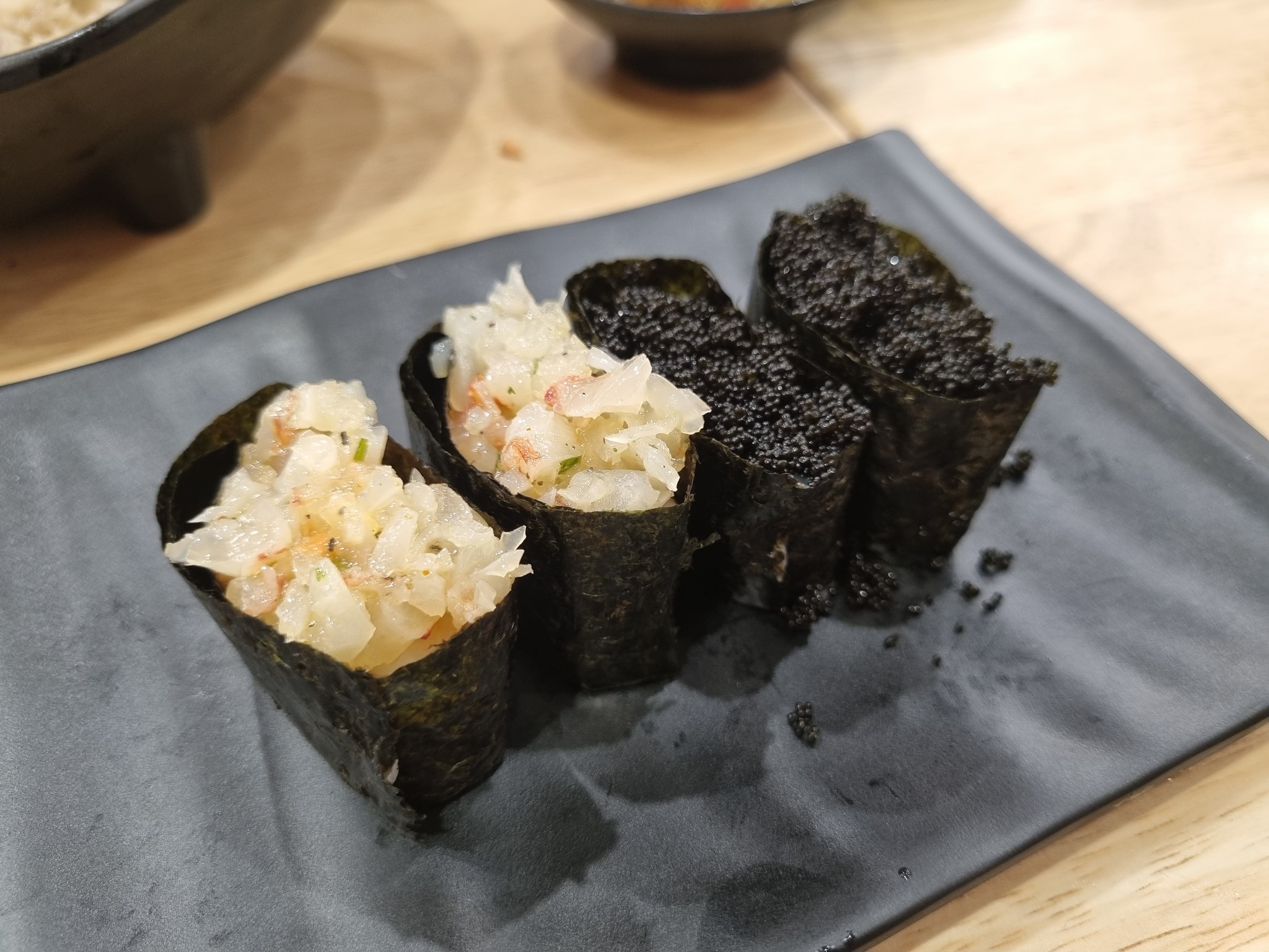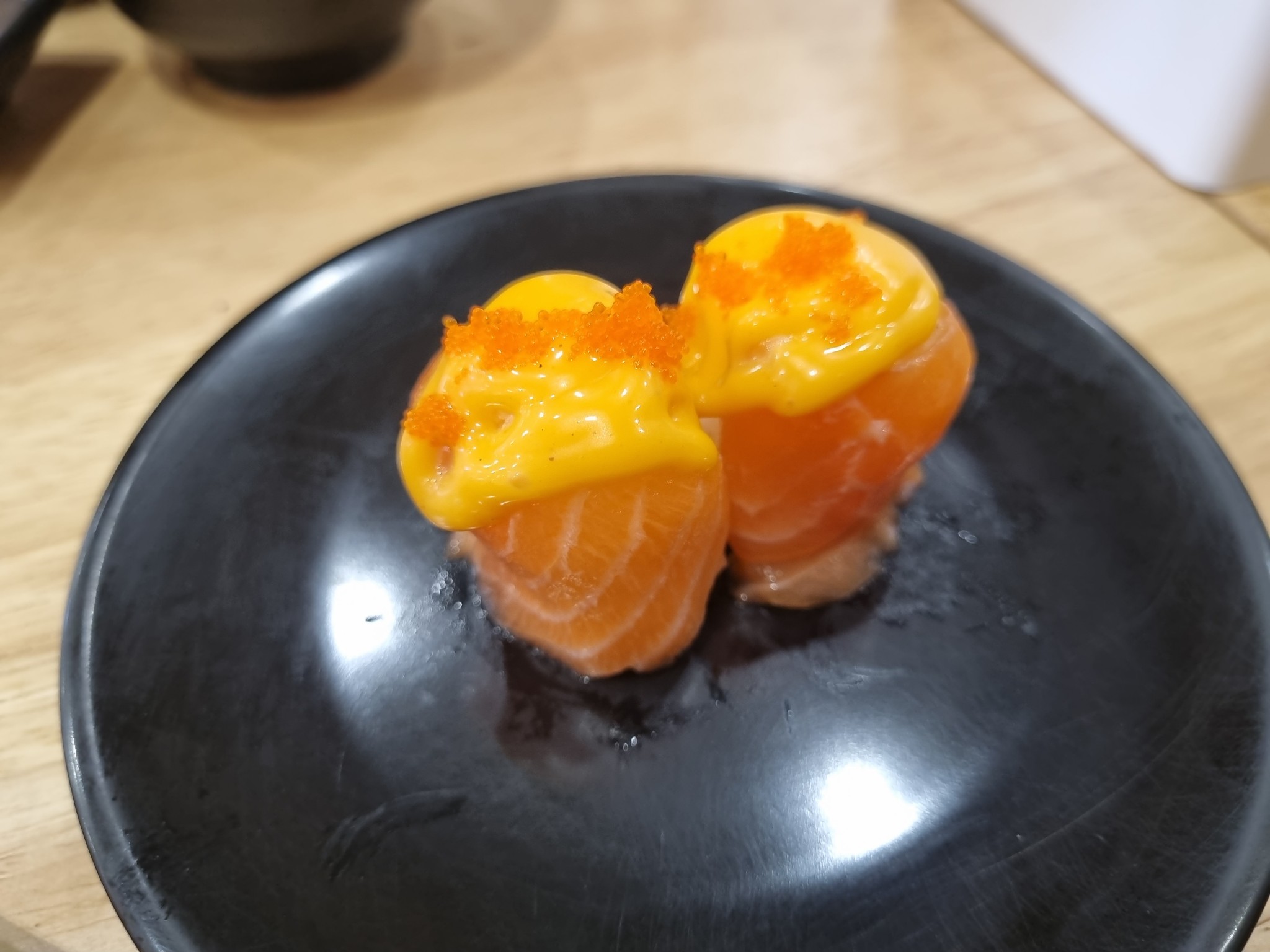 โทบิโกะดำ รสคล้ายไข่แมงดา แต่ดันใส่ซอสชาโคลแปะไว้ด้านล่าง ซึ่งแน่นอน หวานอีกแล้ว เพลียกับการใช้ซอสที่นี่มาก จะติดหวานไปไหนนนน