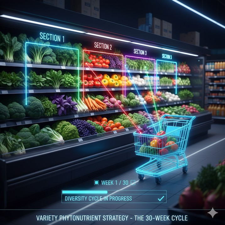 หาก Complete Macro/Micronutrient คือฐานรากที่มั่นคงของบ้าน กลยุทธ์ Variety Phytonutrient ก็คือการสร้างระบบเตือนภัยและอาวุธป้องกันที่หลากหลายและอัปเดตอยู่เสมอ โดยมีเป้าหมายคือการได้รับ สารพฤกษเคมี ให้มากชนิดที่สุดเพื่อความสามารถในการรับมือกับความเสื่อมและอนุมูลอิสระที่หลากหลาย