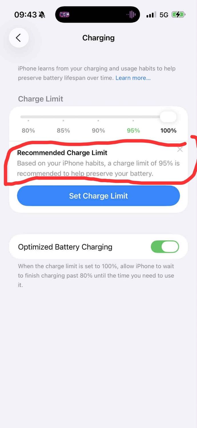 สอบถามค่า มือใหม่ iphone จากในรูป มี 2 คำถามค่ะ 1.หนูเปิดโหมดถนอมแบต แต่หนูตั้งค่าชาร์จให้ถึง 100 แต่ระบบแนะนำให้ตั้งเป็น 95 % ใช่ไหมคะ? 2.ของพี่สาวก็ตั้งค่าแบบเดียวกะหนู ทำไมไม่มีตรง recommen เตือน