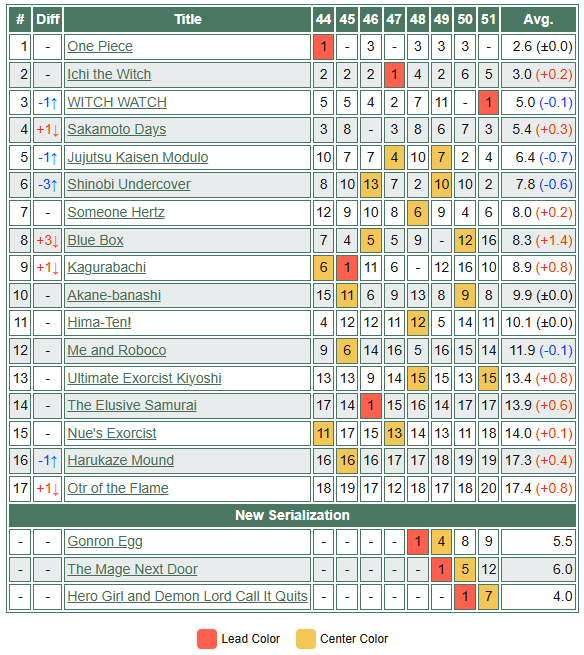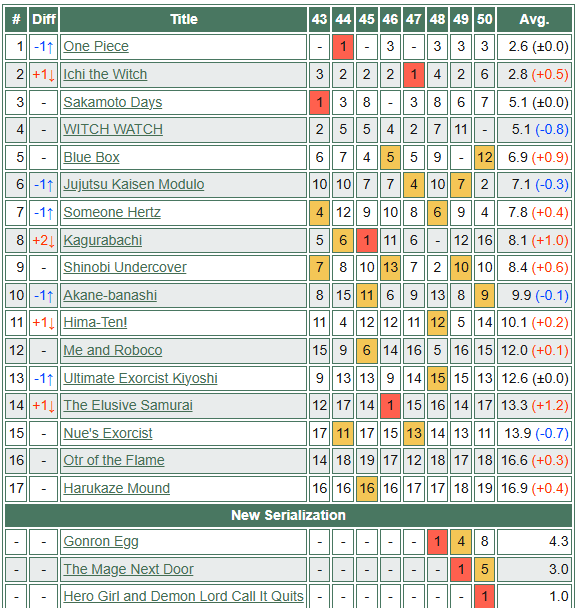 ส่วนเรื่องที่มีค่าเฉลี่ยลดลง -1 คือ otr of the flame Kagurabachi และ Sakamoto Days
