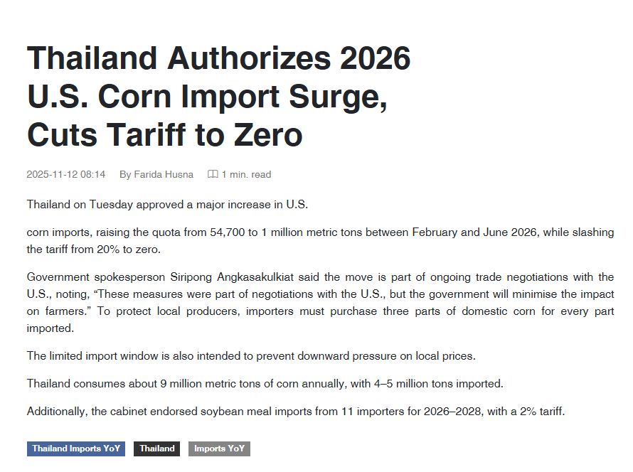 ภายใต้มาตรการนี้ ประเทศไทยจะอนุญาตให้นำเข้าข้าวโพดอาหารสัตว์จากสหรัฐฯ โดยไม่ต้องเสียภาษีนำเข้าสูงสุด 1 ล้านตัน ระหว่างเดือนกันยายน 2568 ถึงเดือนมิถุนายน 2569 แทนที่โควตาเดิม 54,700 ตัน ซึ่งมีอัตราภาษีนำเข้า 20%